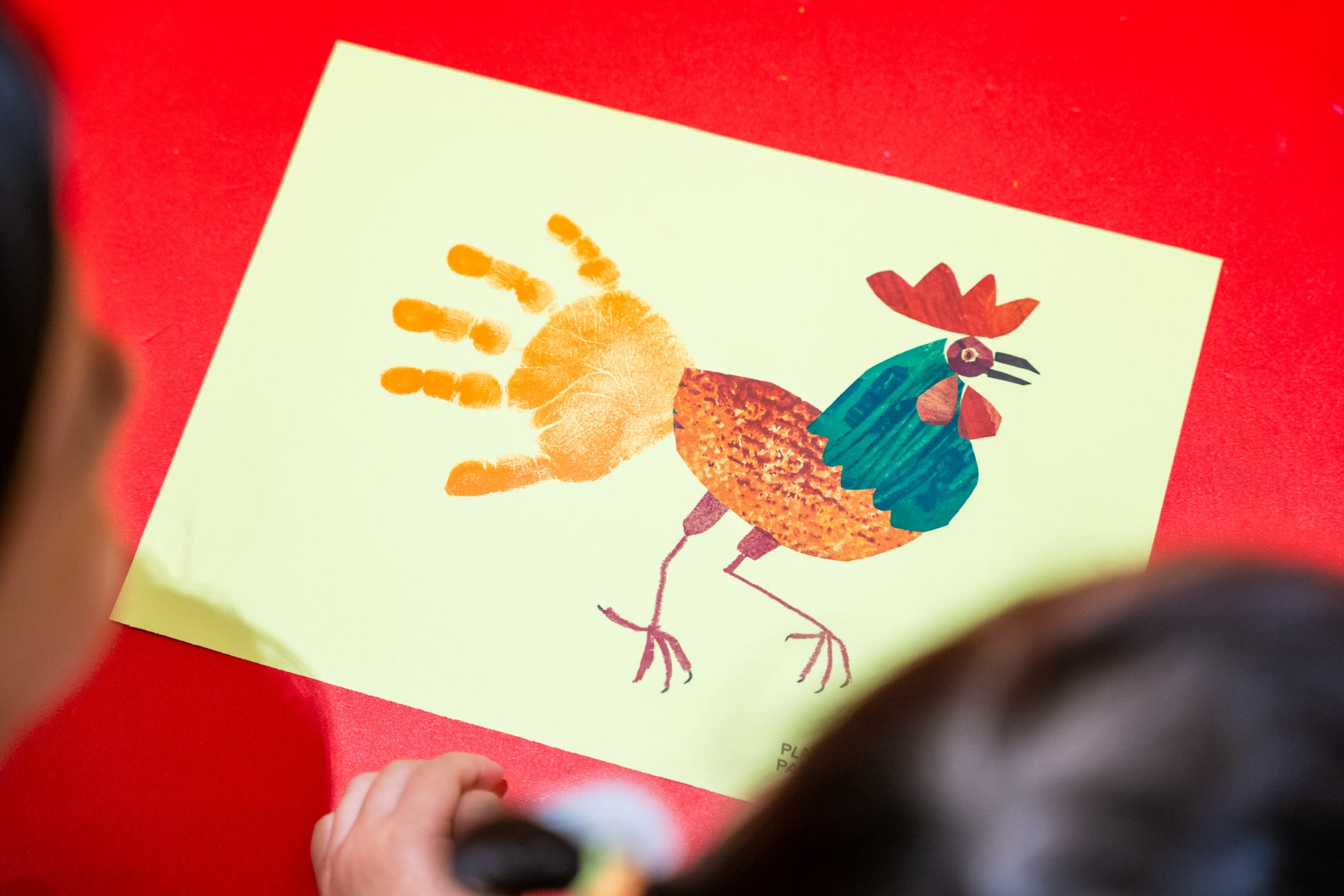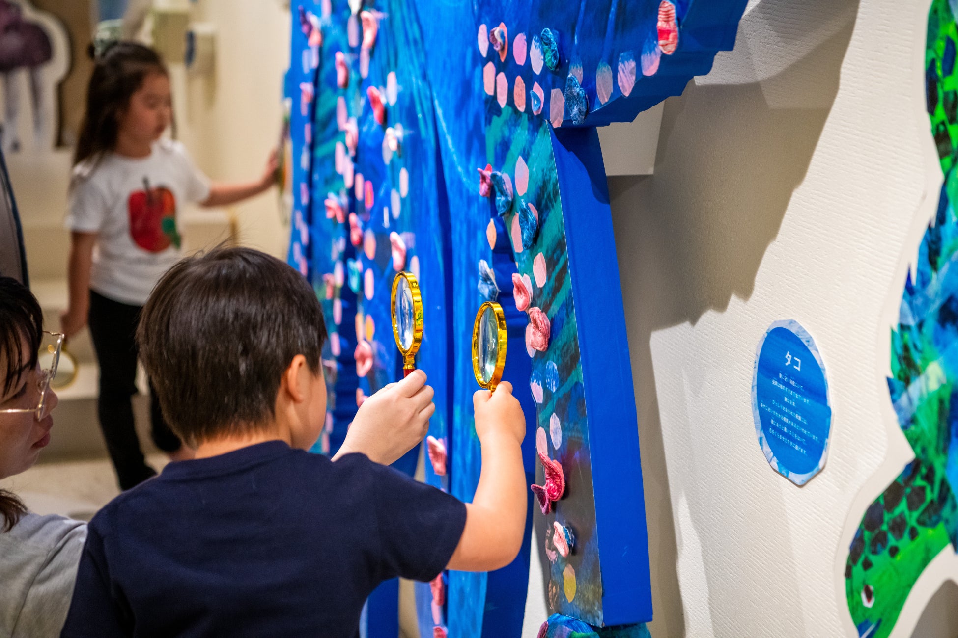 エリック・カールが描いた、いきもののイラストの一部に、手形や足形を押して1つのアート作品を完成させます。期間中は、「大地」「空」「水」のテーマに関連した、いきもののイラストが登場します。