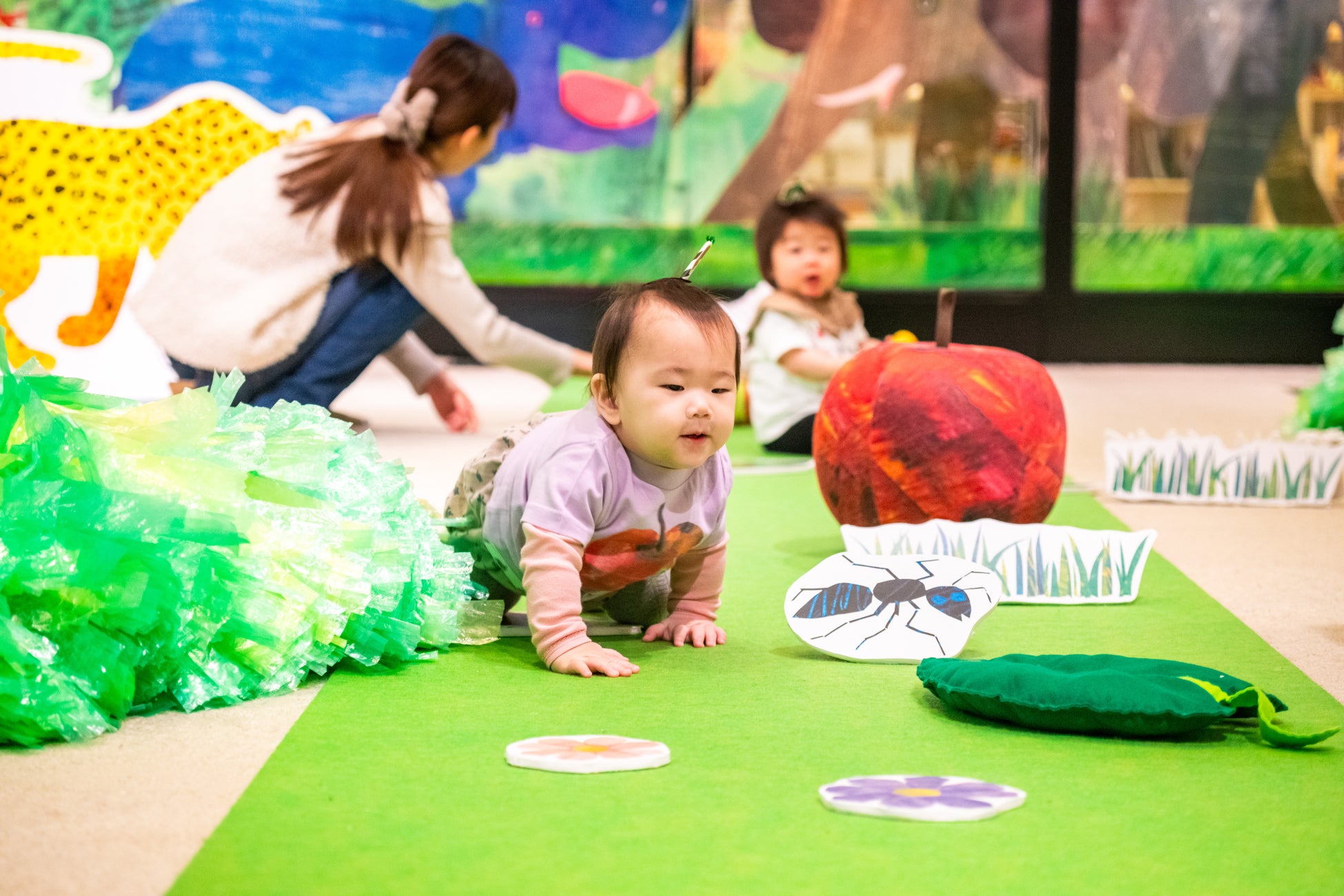 絨毯の上を、ハイハイよちよち歩きで進む、赤ちゃんが対象のワークショップです。赤ちゃんは『はらぺこあおむし』になりきって、エリック・カールが描いた様々ないきものたちに出会いながら進みます。