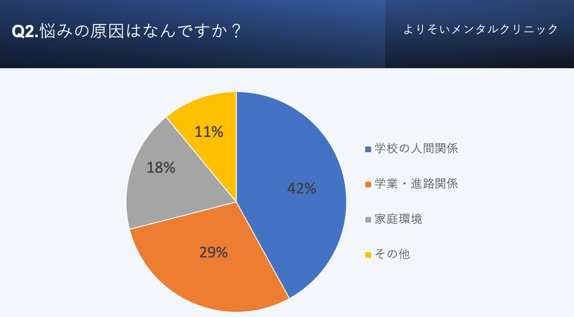 その結果、学校での友達との人間関係が最も多い悩みであることが分かりました。
