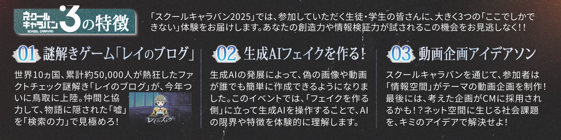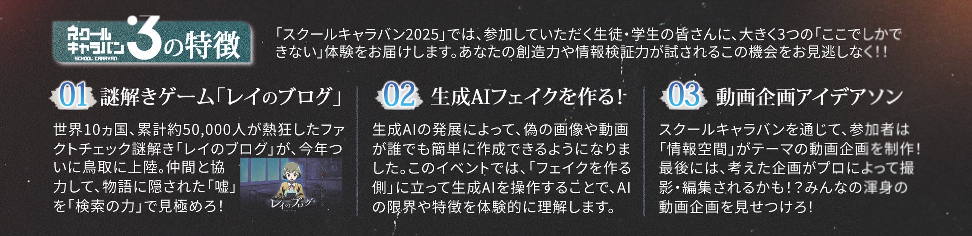スクールキャラバンでは、Classroom Adventureのメディア・リテラシープログラム「レイのブログ」のや、最新の生成AI体験に加えて、情報的健康動画ワークショップを開催します。情報的健康の概念を幅広く広めるための啓発動画の企画を行い、最終的にはプロの手によって撮影・編集が行われます。キャラバンは、県内5つの教育機関の学生が対象です。