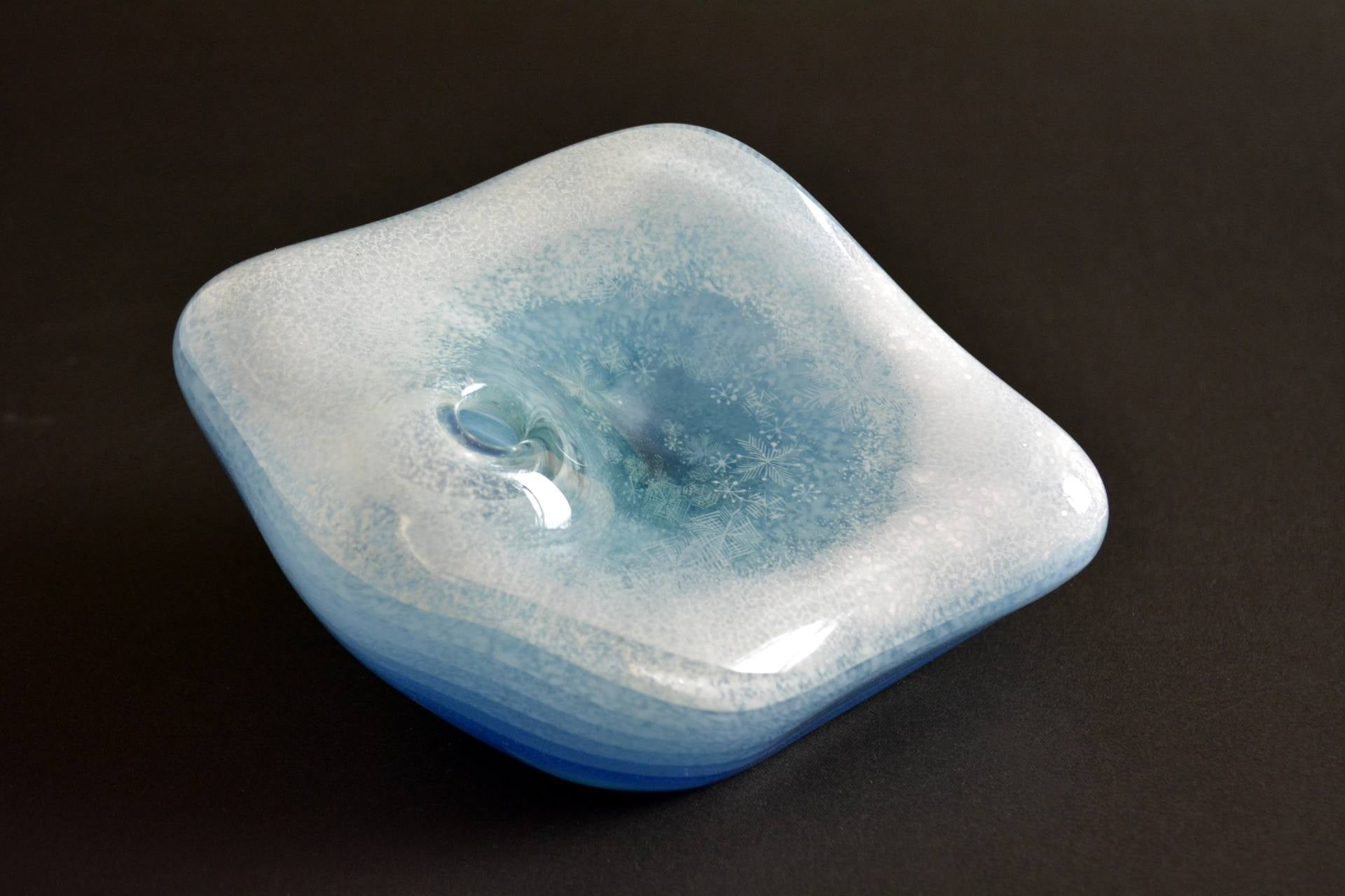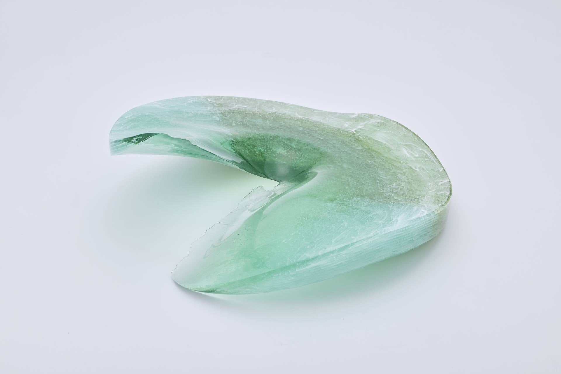 保木氏は、板ガラスに釉薬で絵付けを施し、焼成、研磨の工程を経て作品を制作しています。雪や落葉など、やがて失われていく“朽ちていくもの”をテーマに、器をモチーフとした立体造形を展開しており、ガラスの中にそれらの存在を“溜める”“留める”ように表現しています。器とは「思い」のかたちであるという想いのもと、日々の制作を通じて、その内に宿る時間や感情を丁寧にすくい取るような作品世界を構築しています。