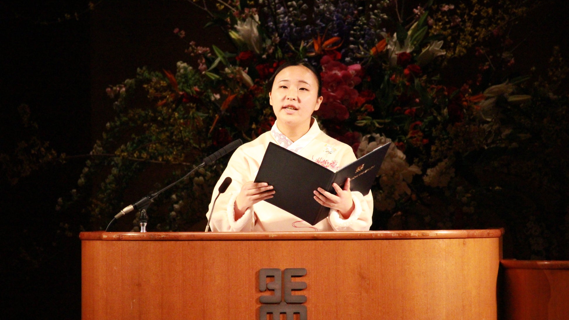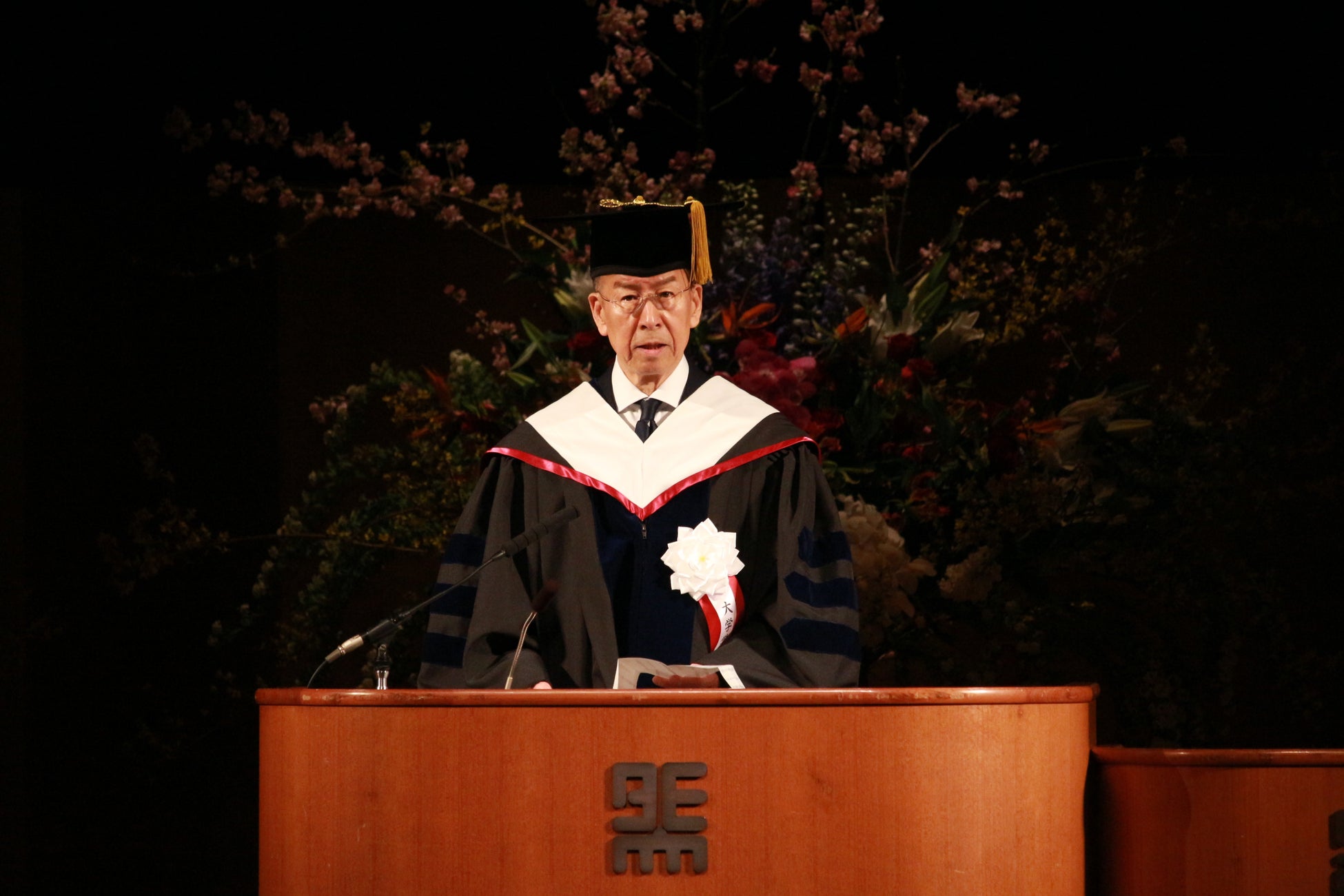 入学式で新たに学長に就任した菊池清明氏は関西外大で外国語を学び、留学して知見を広げることの意義を述べました。告辞で「日本の大学生約62万人のうちで卒業時に英語の学力が英検準一級、TOIEC700点などのレベルは3%程度だが、関西外大は18%を超えています」と学習カリキュラムに沿って学習すれば上達が可能になり、留学などで知見を広げてグローバルでの活躍を期待していました。最後に「今日という日を、この一瞬を大事に生きる」という意味を持つ「Carpe Diem」という言葉を挙げました。「一日をいとおしみ、大切にして、真剣に生きた人が最終的には人生において自分の目標を達成できるのです」と述べました。