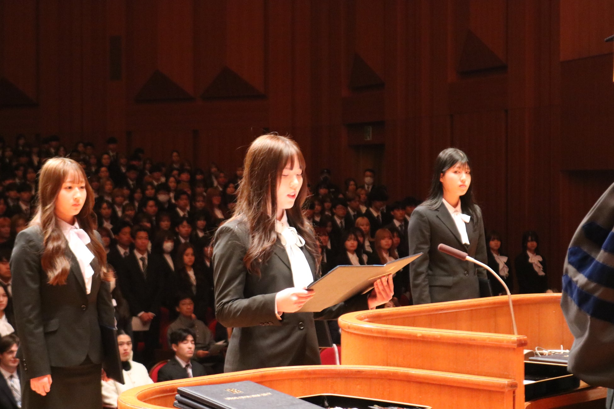関西外国語大学(大阪府枚方市)で4月2日2025年度入学式が行われ、大学院、各学部、短期大学部計3718人(3年次編入を含む)の新入生を迎えました。新設されたアジア共創学科には212人が入学しました。