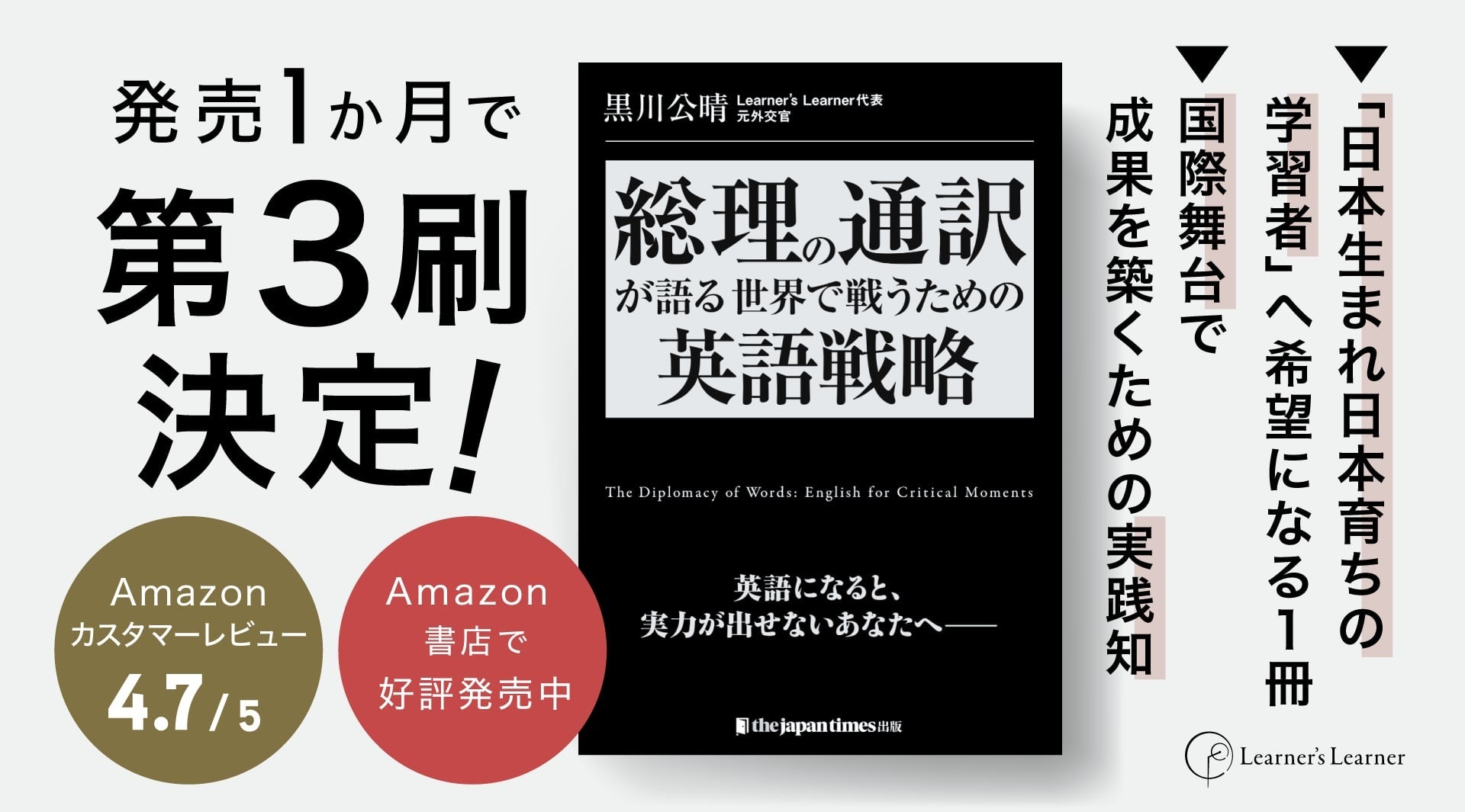 2025年10月30日にジャパンタイムズ出版より刊行された黒川公晴氏の新刊『総理の通訳が語る——世界で戦うための英語戦略』が発売から1か月を迎え、このたび 第3刷(重刷)が決定いたしました。