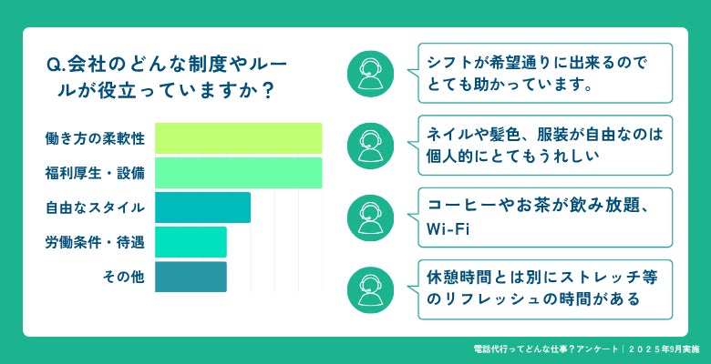 コールセンター業界といえば「離職率が高い」というイメージが強いですが、今回のアンケートから、電話代行サービスで働くオペレーターの職場環境には、長く勤めやすい条件が多く備わっていることが明らかになりました。