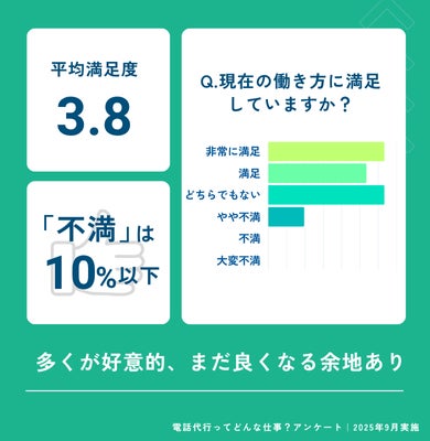 電話代行・秘書代行などの BPO サービスを提供する電話代行サービス株式会社(以下、当社)(所在地:大阪市淀川区、代表取締役:玉川正義)は、自社で勤務する社内オペレーターを対象に「コールセンター業務の実態および職場環境」に関するアンケート調査を実施し、61名から回答を得ました。結果、4年以上の長期勤続が 46%、働き方満足は 9 割、人間関係満足は 75%と、コールセンター業界の一般的なイメージを覆す実態が明らかになりました。