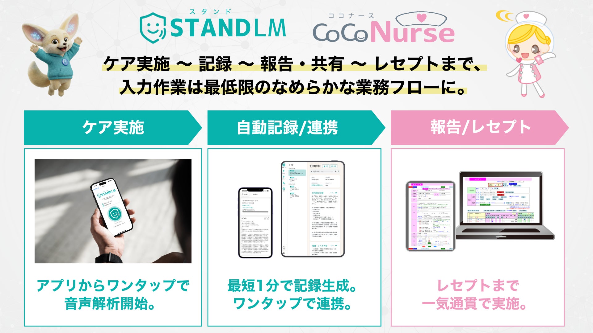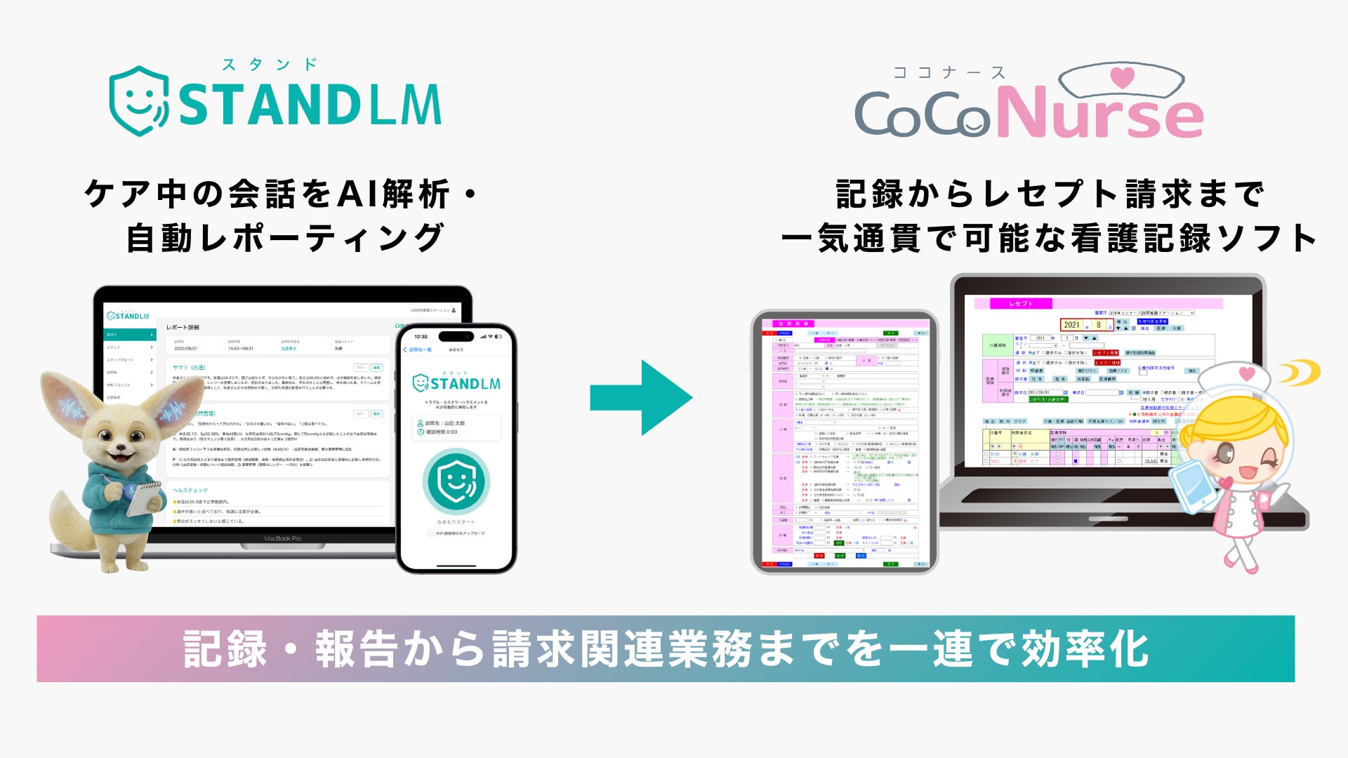 音声AIアシスタント「スタンドLM」が訪問看護記録システム「ココナース」と自動連携を開始。会話から生成した記録をワンタップで反映し、訪問看護の記録を「移動中に書く」業務から解放