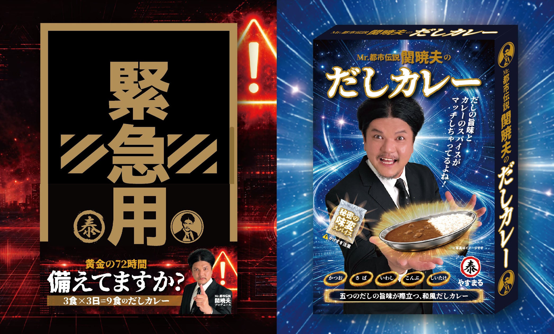 Mr.都市伝説 関暁夫が届ける、防災×美味しさの新提案。 災害時にも、日常にも。 “本当に使える備え”として生まれた保存できて、美味しく食べられるレトルトカレー。いつ起こるか分からない災害。 だからこそ、普段から美味しく食べながら備える!「ローリングストック」としてご活用ください。さらに!味をより楽しめる “秘密のスパイス”付き。 災害時。ひとりで不安な夜でも、体だけでなく、心まで温まるホットな味に仕上げました。こだわりは――やすまる出汁がさえる、奥深い旨味。備えとして。 日常のご褒美として。大切な人を守るために。ぜひ一度、お召し上がりください。