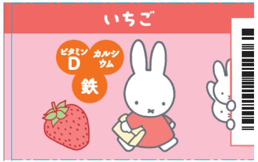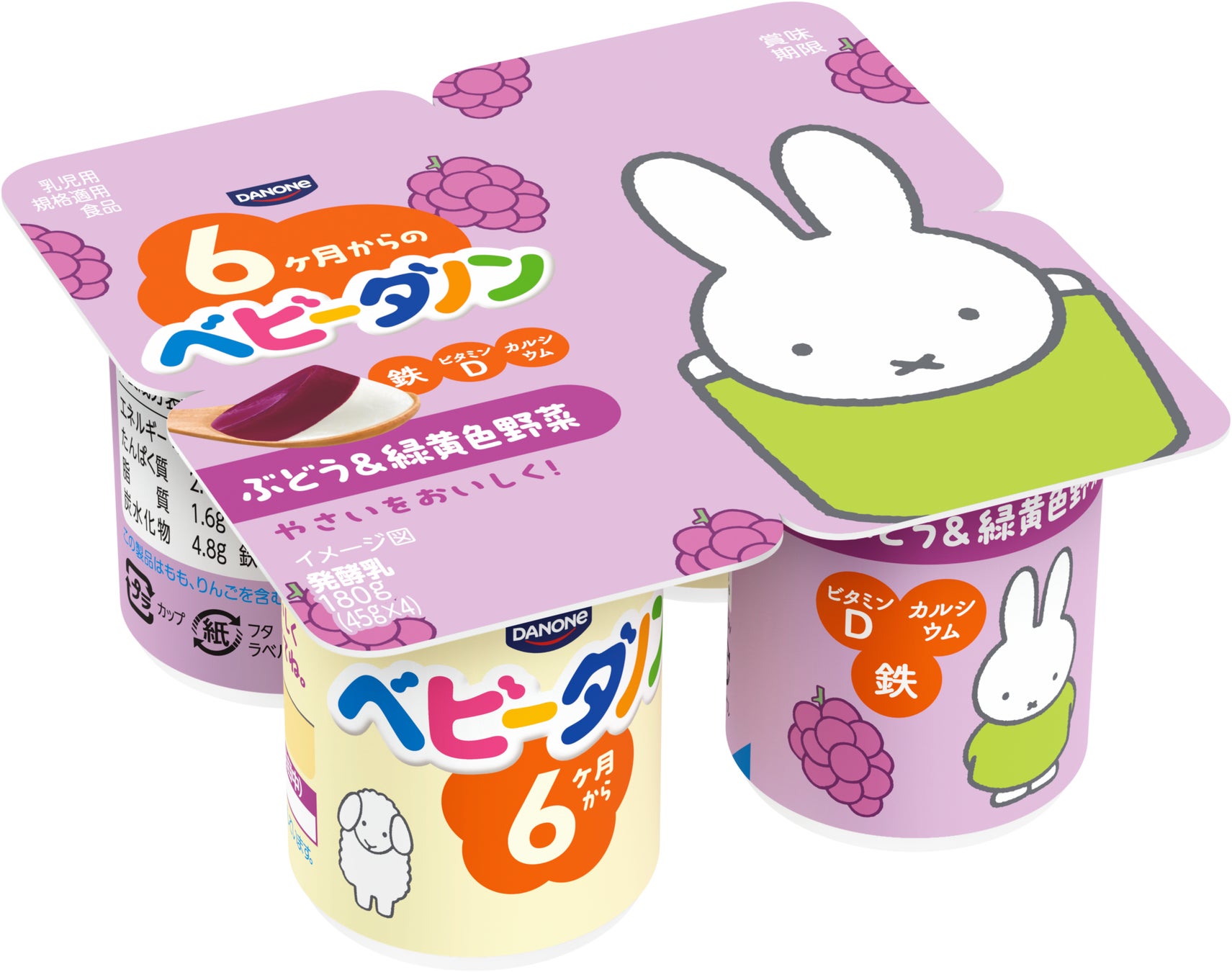 「ベビーダノン」の全4種類のフレーバー(プレーン 乳糖の甘みだけ、いちご、もも&緑黄色野菜、ぶどう&緑黄色野菜)がミッフィーとコラボレーションした特別なパッケージで店頭に登場します。パッケージの表面だけでなく、側面にも、ミッフィーをはじめ、ディック・ブルーナの世界のキャラクターたちが描かれており、製品バーコードの奥からこちらをそっと覗くミッフィーなど、親子で楽しめる遊び心あふれるデザインとなっています。