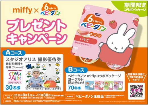 また、2025年9月1日(月)から11月30日(日)までの期間中、ベビーダノン(プレーン 乳糖の甘みだけ、いちご、もも&緑黄色野菜、ぶどう&緑黄色野菜のいずれか)を含む500円(税込)以上のお買い物レシートでご応募いただけるプレゼントキャンペーンを開催します。ご応募いただいた方の中から抽選で、ミッフィーや仲間たちと記念撮影ができるスタジオアリスの撮影優待券などが当たります。
