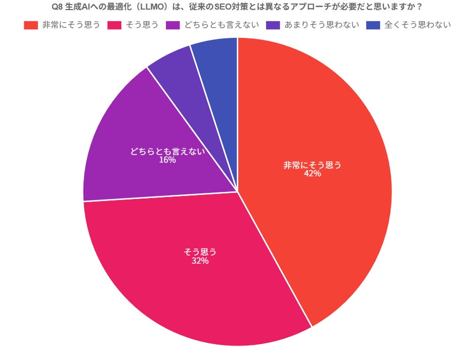 LLMOという新しい概念に対して、多くの専門家や担当者が、従来のSEOの延長線上にはない、独自の戦略や手法が必要となる新しい領域として捉えていることを明確に示しています。「非常にそう思う」「そう思う」を合わせた高い肯定率は、生成AIの情報処理メカニズムやユーザーとのインタラクションが、従来の検索エンジンのそれとは根本的に異なるとの認識が広まっていることの表れです。