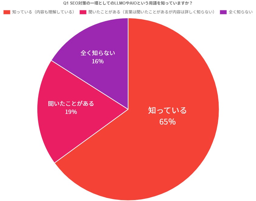 一方で、「聞いたことがある」と「全く知らない」を合わせると35%となり、依然として3割強の層にはこれらの用語や概念が十分に浸透していないことも示されています。特に「聞いたことがある」と回答した層は、言葉自体は認知しているものの、その具体的な内容やSEOへの活用方法についてはまだ理解が及んでいない可能性があります。