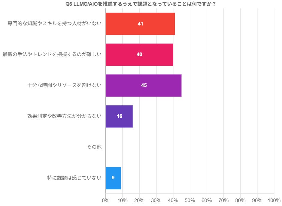 ほぼ同率で「人材不足」と「情報収集の困難さ」が続いている点は、LLMO/AIOが高度な専門性と迅速な情報更新が求められる新しい分野であることの証左と言えます。市場に専門知識を持つ人材がまだ少ない上に、技術やトレンドの進化が非常に速いため、企業が自力でキャッチアップし、適切なスキルを持つ人材を確保・育成することが大きな負担となっています。