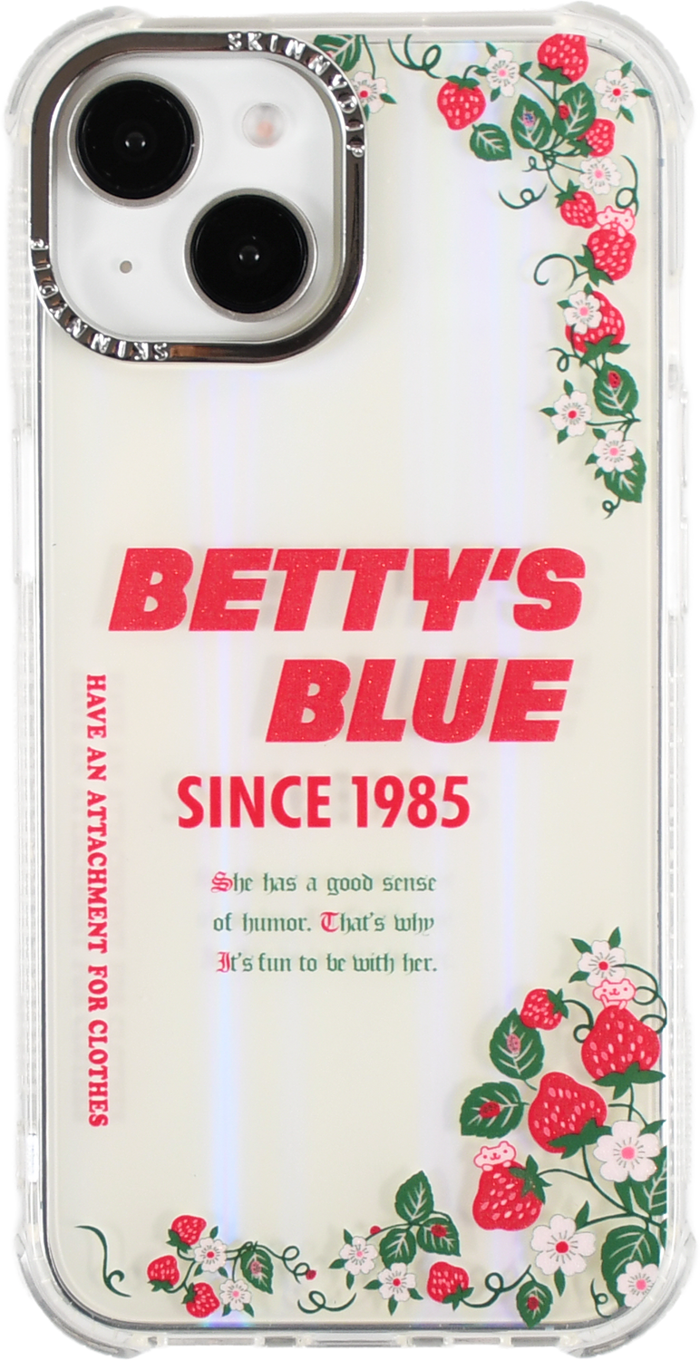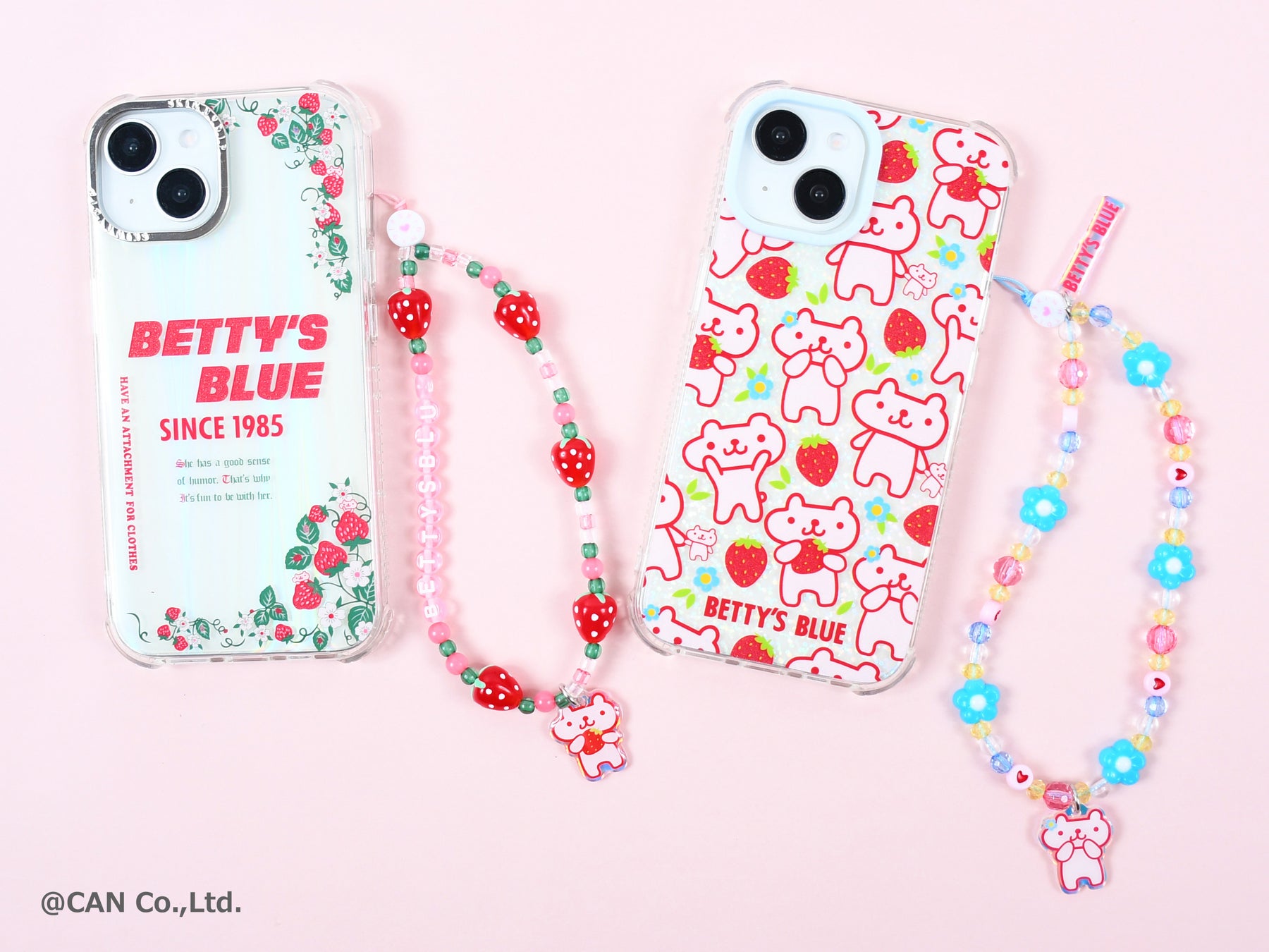 BETTY’S BLUEの当時のショッパ―アートを使用したフォンケースと、エイミーちゃんをグリッターでキラキラにデザインしたフォンケース。ホログラムやグリッターでキラキラにデザインを行い、SKINNYDIPらしい遊び心のあるデザインに仕上げました。