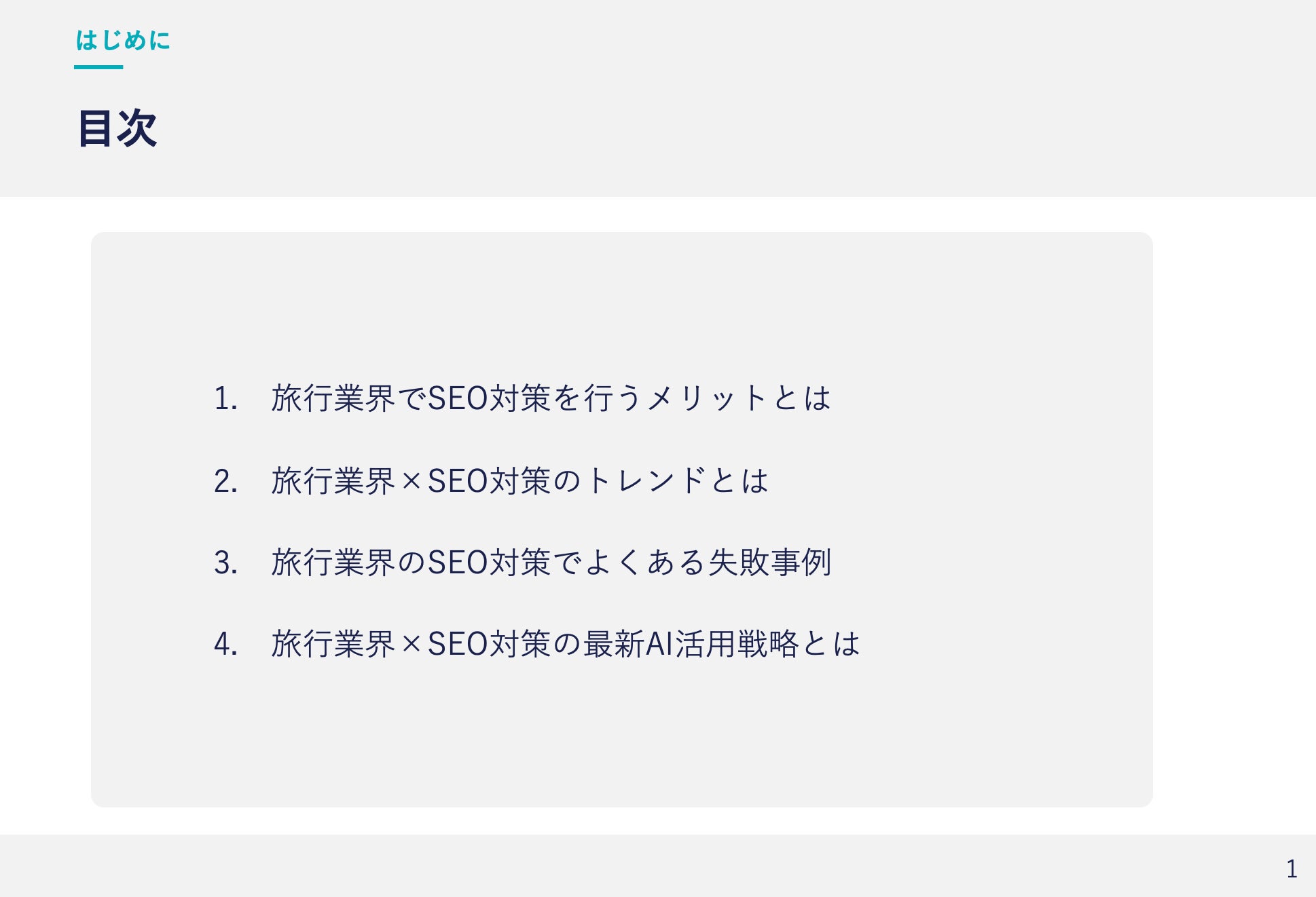 「2025年版 旅行業界向けAI×SEOトレンドレポート」は、当社公式ウェブサイトより無料でご請求いただけます。この資料はAI化が進む現代において、旅行業界でできるSEOでのAI活用法を徹底的に解説しています。