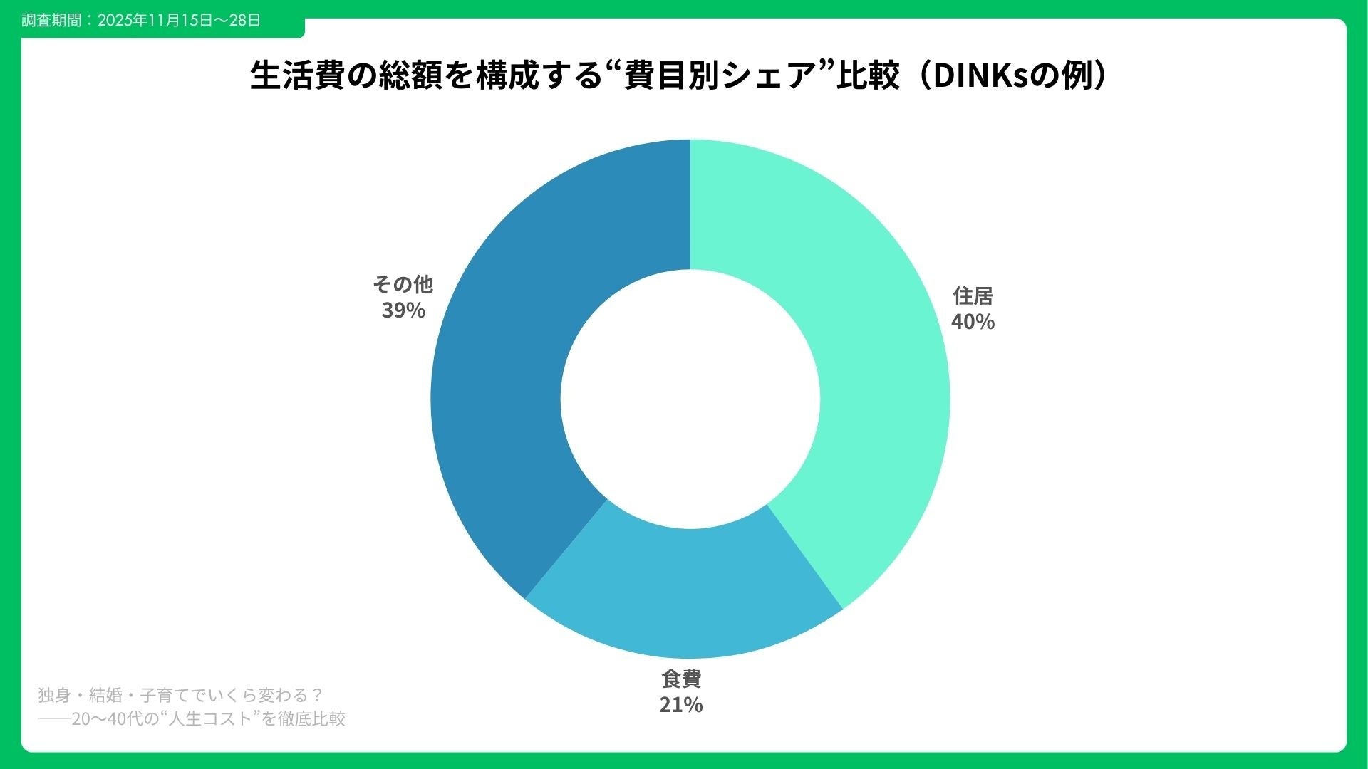 20〜40代の生活は、独身から結婚、さらに子育てへと変化する中で、生活コストの構造が大きく変わります。今回の調査では、3つのライフステージにおける毎月や年間の支出、可処分所得に対する負担割合、資産形成への影響を徹底比較。支出項目の傾向や費目別の増減ポイント、貯蓄率の変化まで、実態を詳細に分析しました。
