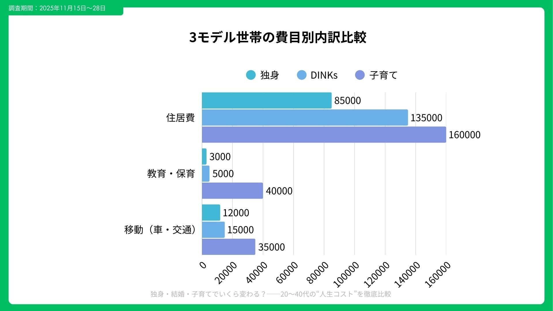 年間総支出を見ると、独身から結婚、子育てと進むにつれて費用は大幅に増加。特に「住居費」「教育・保育」「移動費」が増加要因として目立ちます。