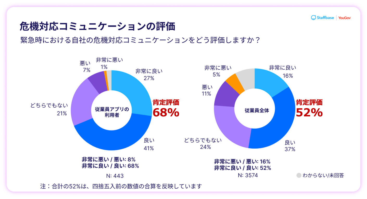 従業員アプリを主要チャネルとして利用している組織では、68%が自社の危機対応コミュニケーションを「非常に良い」「良い」と評価しました。これは全体平均の52%を大きく上回る結果です。