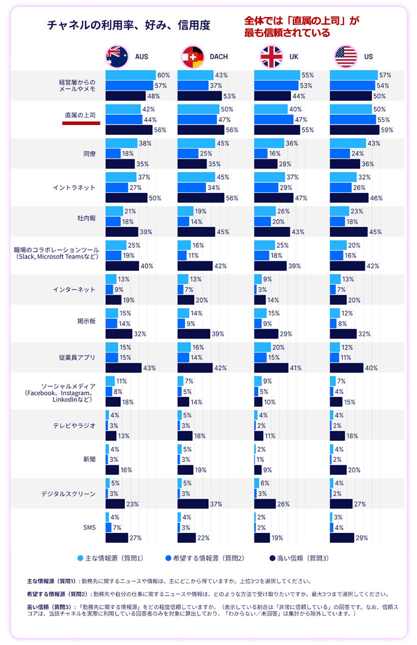 従業員が最も信頼できる情報源として挙げたのは、直属の上司でしたが、一方で、従業員アプリを利用している場合は、アプリからの情報を最も信頼していると回答しました。信頼される“人”と“チャネル”の両面を設計することが、社内コミュニケーションの鍵であることが示されました。