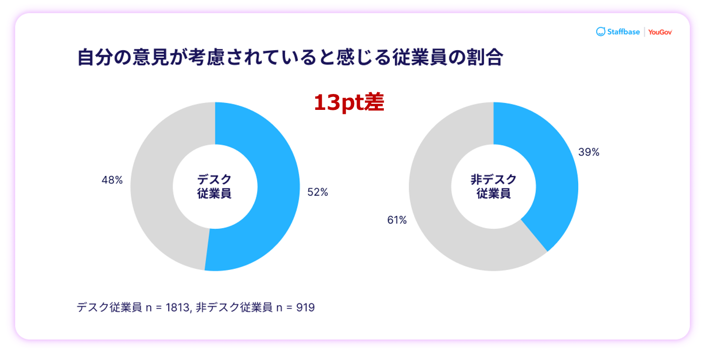 「自分の意見が考慮されている」と感じている割合は、デスク従業員が52%、現場従業員は39%にとどまり、現場ほど意思決定との距離を感じやすい。