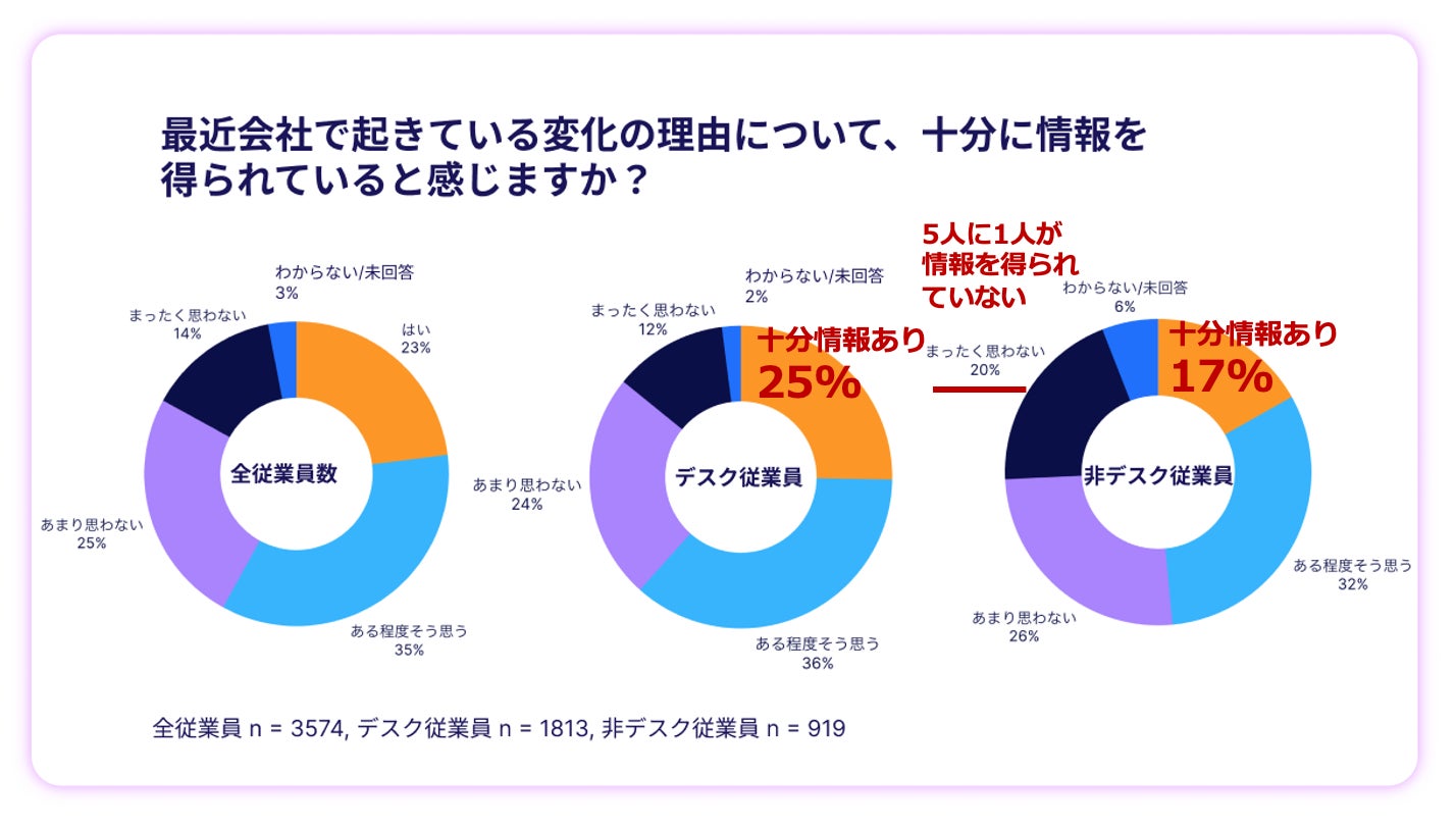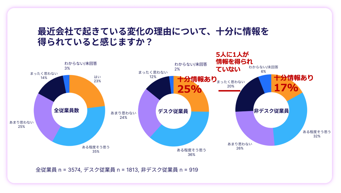 会社の変化の理由について、十分な情報を得られていると感じている割合は、デスク従業員で25%、現場従業員で17%にとどまる。さらに現場従業員では、5人に1人(20%)が十分な情報を得られていないと感じている。