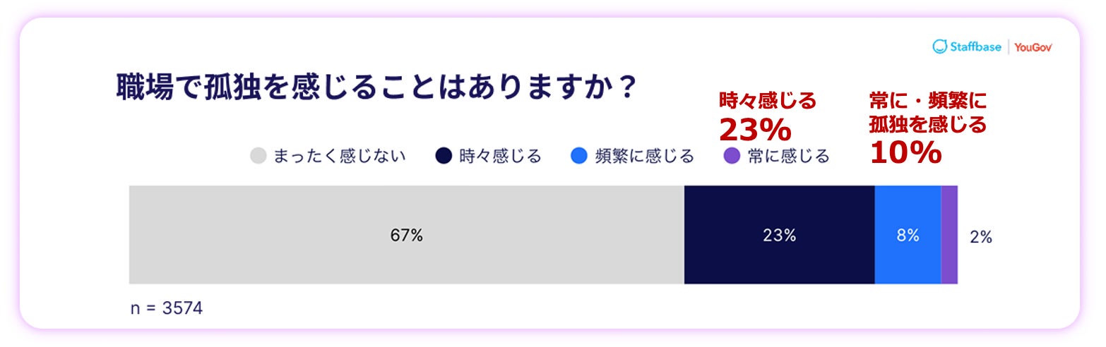 従業員の10%が職場で「常に(2%)」または「頻繁に(8%)」孤独を感じていると回答し、さらに23%が「時々感じる」としています。