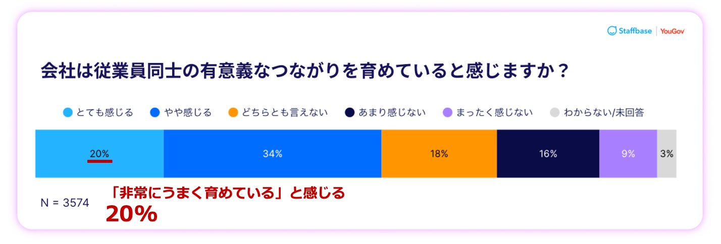 一方で、従業員同士の有意義なつながりを会社が「非常にうまく育めている」と感じているのは、わずか20%にとどまりました。職場でのつながりを十分に実感できていないことが、孤独感の一因となっている可能性がうかがえます。