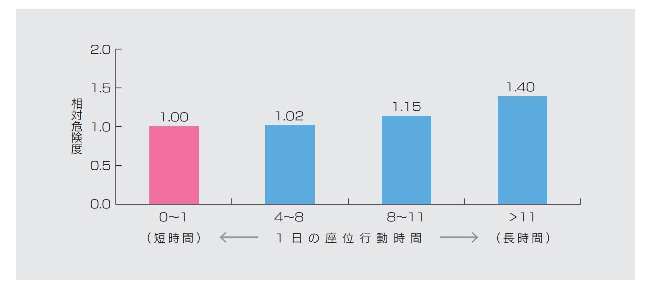厚生労働省がまとめている資料では、一日の着座時間が長い場合、寿命や健康に影響を及ぼす可能性があることが報告されている。
