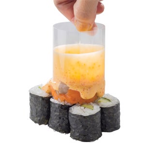 角切りサーモンをトッピングしたかっぱ巻きの上から、オリジナルの甘酸っぱい人参ソースが溶岩(Lava)のようにとろりと流れ落ちます。目を引く、思わず手を伸ばしたくなる商品です。