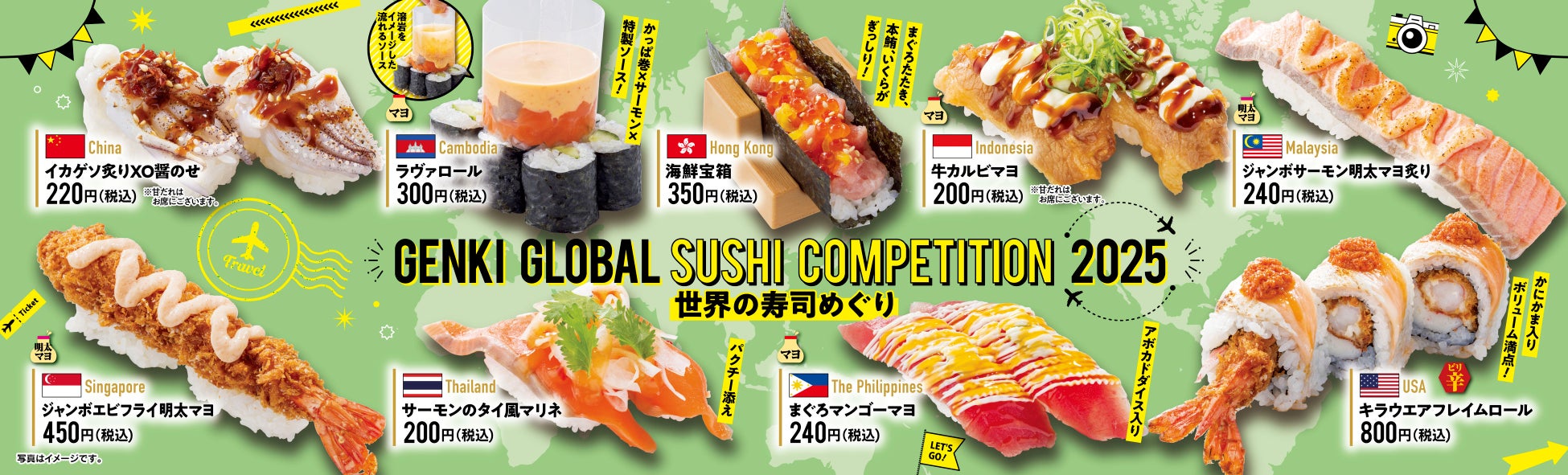 レストランチェーンの運営を手がける株式会社Genki Global Dining Concepts(本社:東京都台東区 代表取締役 社長執行役員 藤尾益造)は、東京・上野に誕生したコンセプトストア「GENKI SUSHI×魚べい」にて、世界各国の味覚と創造性が競い合うグローバルフェア「GENKI Global Sushi Competition 2025」を、2025年11月28日(金)より開催いたします。今回は、GENKI SUSHIが展開する12の国・地域のうち、9の国・地域からエントリーした商品が集結。各国の店舗で生まれた多彩なオリジナルメニューを日本で初披露します。世界の個性が融合した、新しいグローバルな寿司体験をお届けします。