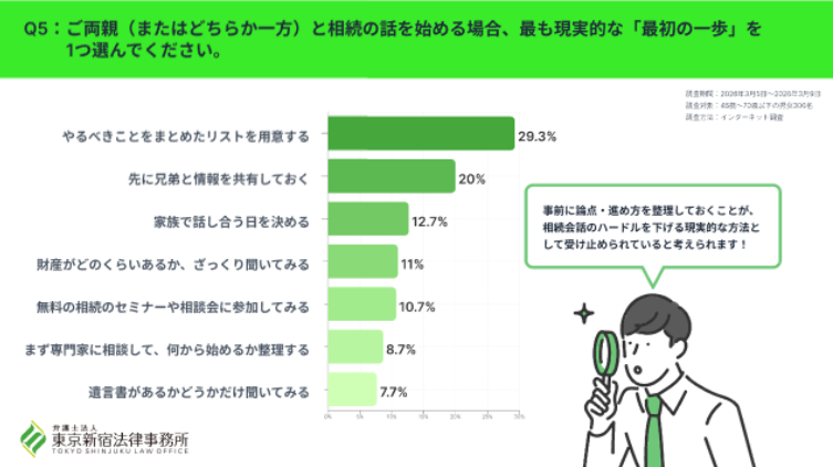 親と相続の話を始める際の最も現実的な最初の一歩としては、「やるべきことをまとめたリストを用意する」(29.3%)が最多で、「先に兄弟と情報を共有しておく」(20.0%)が続きました。