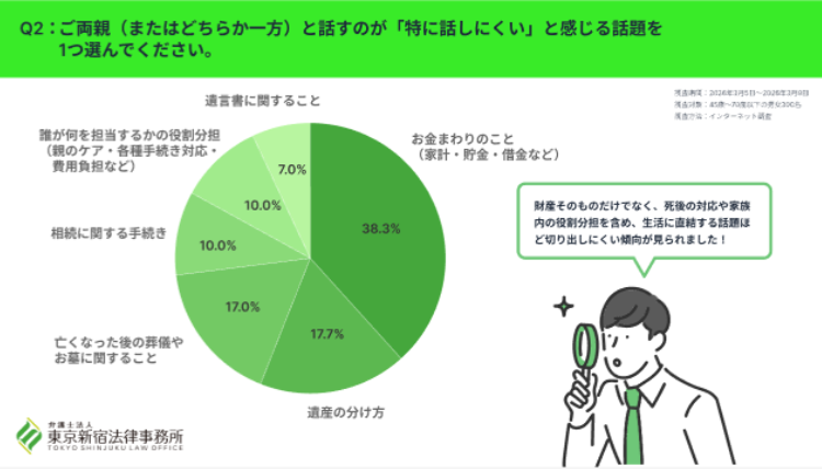 特に話しにくい話題としては、「お金まわりのこと(家計・貯金・借金など)」(38.3%)が最多となりました。続いて「遺産の分け方」(17.7%)、「亡くなった後の葬儀やお墓に関すること」(17.0%)が続きました。
