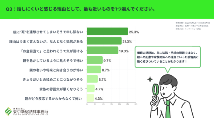 相続の話題は、単に法務・手続の問題ではなく、親への配慮や家族関係への遠慮といった感情面と強く結びついていることがわかります。