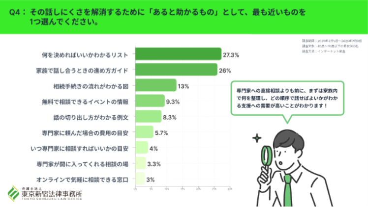 そうした話しにくさを解消するために役立つものとしては、「何を決めればいいかわかるリスト」(27.3%)、「家族で話し合うときの進め方ガイド」(26.0%)が上位となりました。
