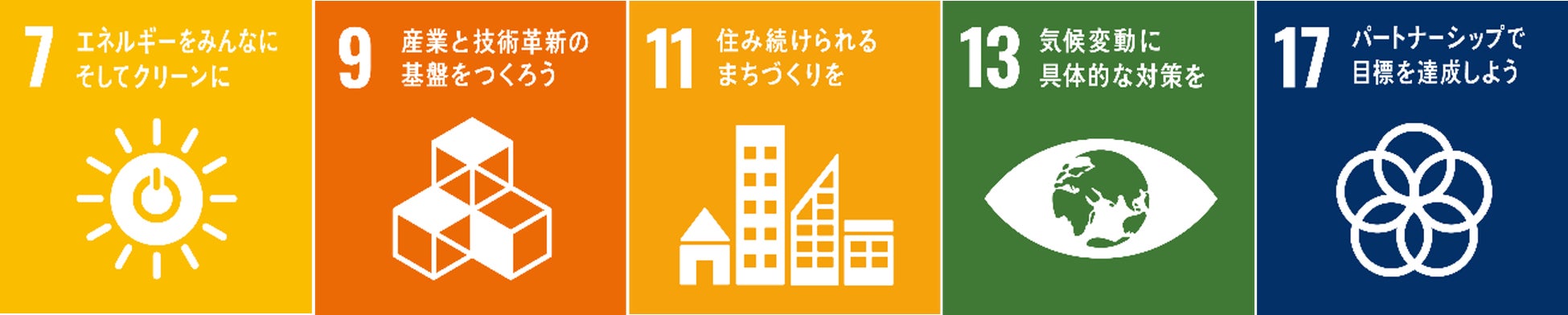 今回の取組は、SDGsの17のゴールのうち、特に7番、9番、11番、13番、17番に貢献するものと考えております。