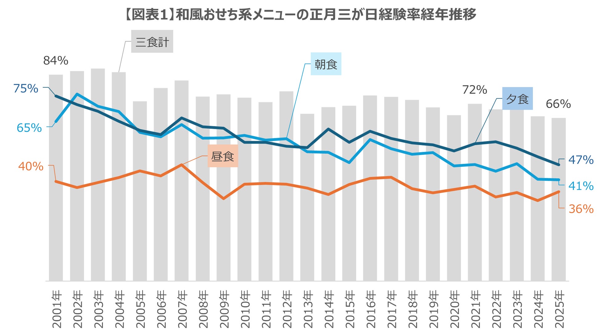 朝昼夕を合算した三食計での経験世帯率を見ると、25年前、和風おせちメニューは8割超の家庭の食卓に上がっていました。その値は現在まで緩やかに縮小し続け、2025年現在では66%となっています。縮小の事実はある一方、和風おせち料理が現代においても7割近くもの家庭で食べられていることは意外な結果であると感じられます。