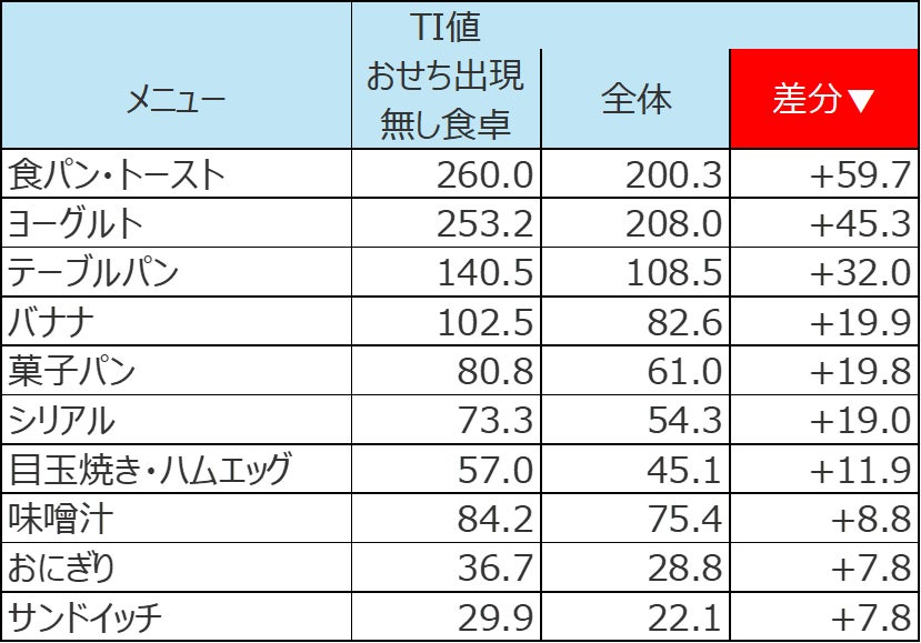 まずは朝食です。【図表4】を見ると、パン類やシリアルにヨーグルト、バナナ、目玉焼き・ハムエッグといった洋軽食メニューの出現が多くなっています。おせち無し朝食卓では、「おせちは無いが餅は食べる」ということもなく、日常的な食事をとることが多いようです。