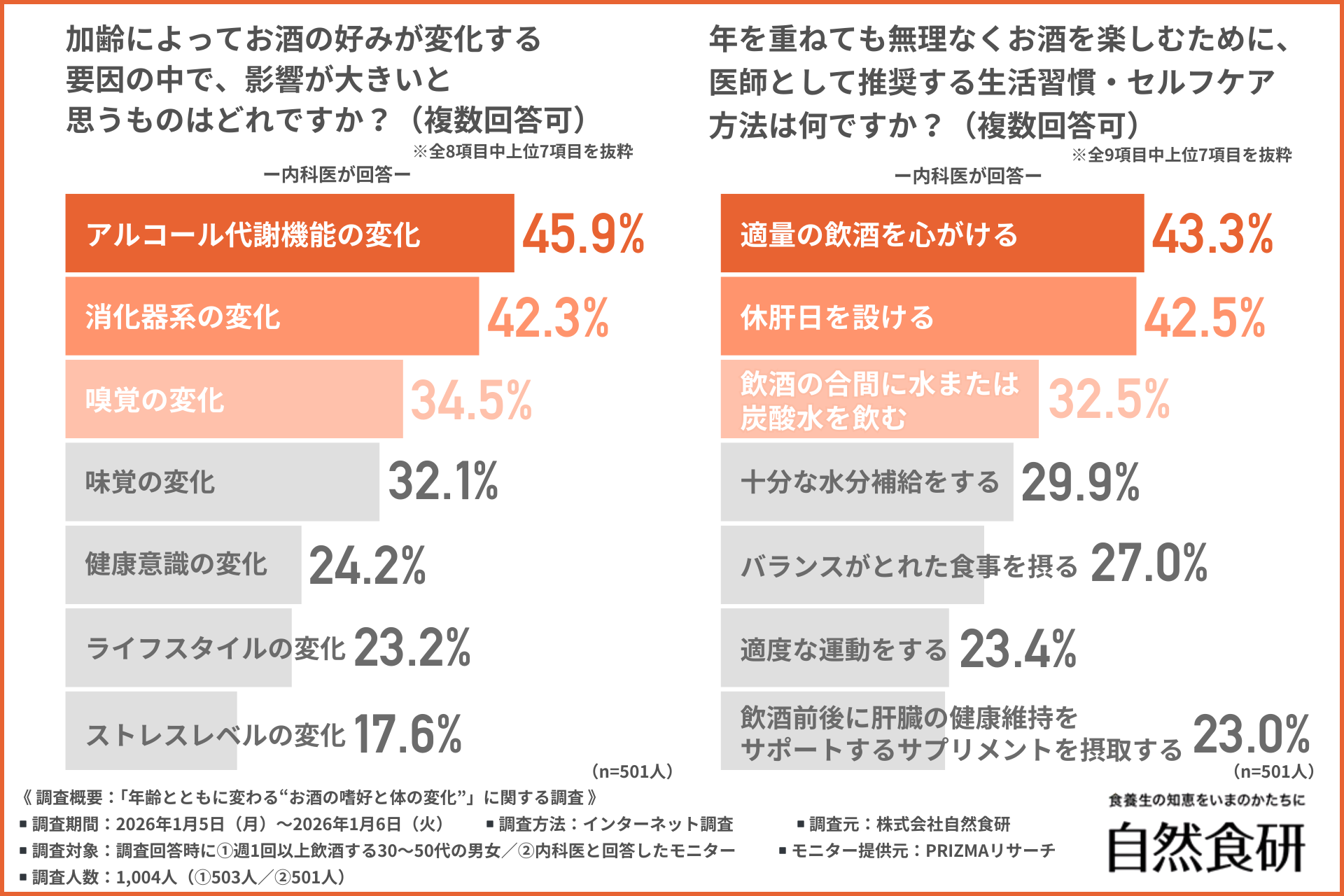 そこで今回、株式会社自然食研(https://www.sizenshokken.co.jp/)は、①週1回以上飲酒する30〜50代の男女/②内科医を対象に、「年齢とともに変わる“お酒の嗜好と体の変化”」に関する調査を行いました。