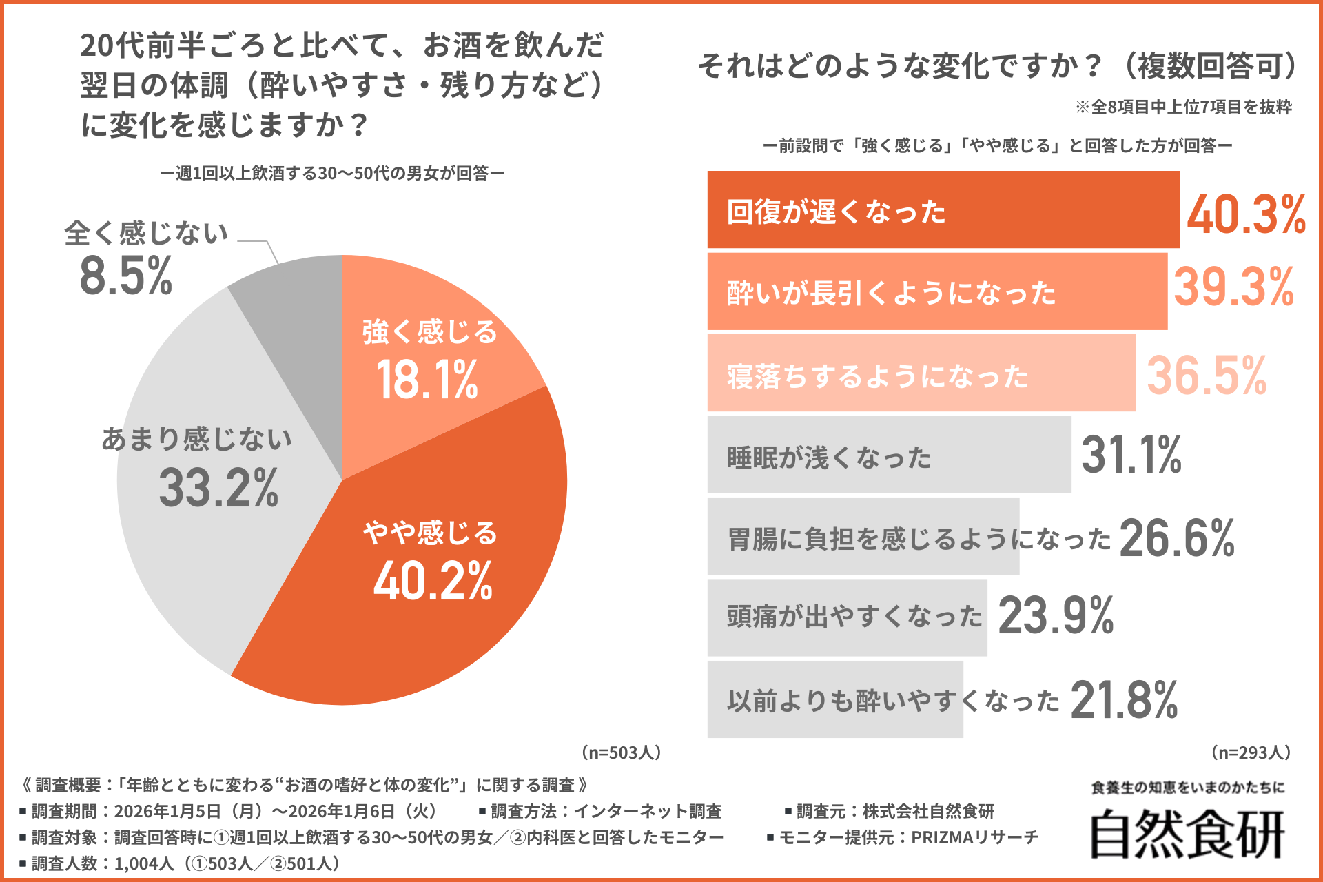 「20代前半ごろと比べて、お酒を飲んだ翌日の体調(酔いやすさ・残り方など)に変化を感じるか」と尋ねたところ、約6割が『強く感じる(18.1%)』『やや感じる(40.2%)』と回答しました。