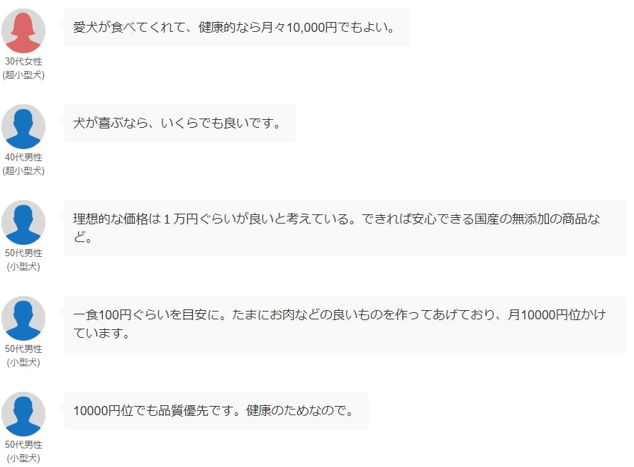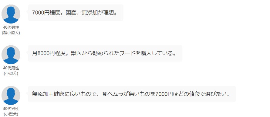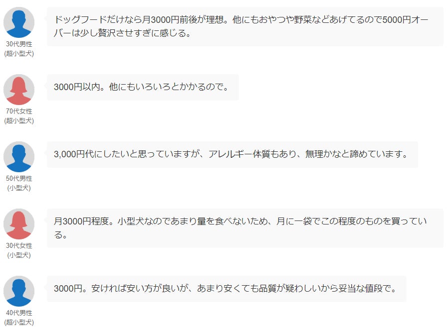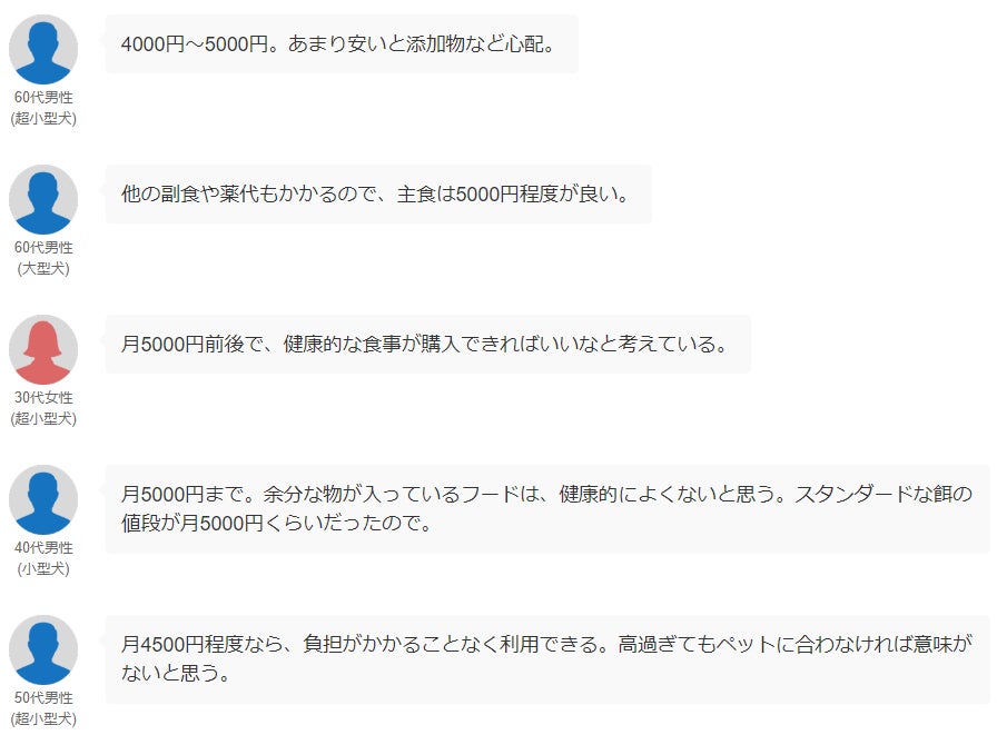 最後に、飼い主さんが考える“理想のフード代”についても質問を実施。それぞれの価格帯に寄せられたリアルな声を抜粋してお伝えします。