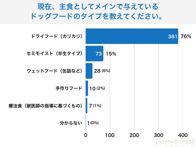 主食として与えているフードでは、「ドライフード(カリカリ)」が76%と圧倒的多数でした。