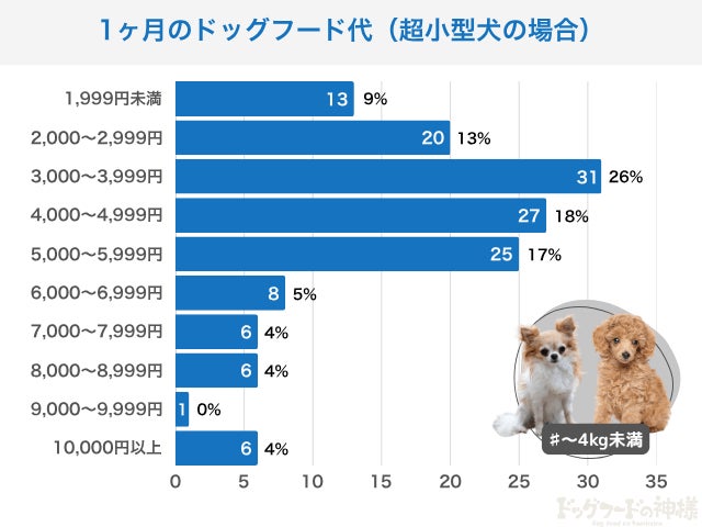 超小型犬のフード代は「3,000~5,999円」に集中しています。なかでも「3,000~3,999円」が最も多い価格帯でした。