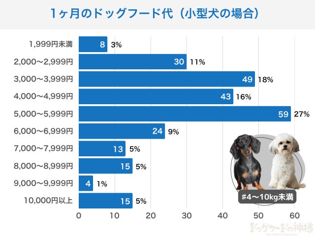 小型犬のフード代も「3,000~5,999円」が中心で、特に「5,000~5,999円」が最多(27%)という結果に。