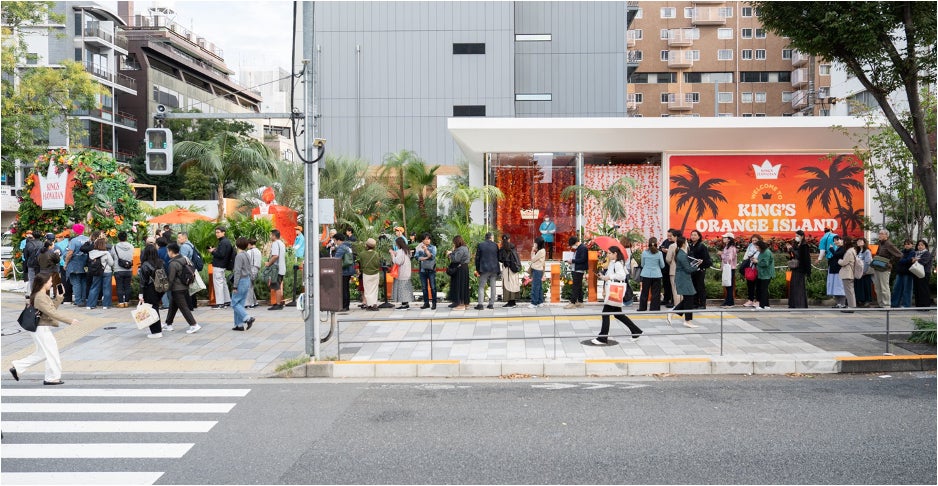 「KING’S HAWAIIAN」の日本本格上陸を記念したPOP UP「KING’S ORANGE ISLAND」では、ブランドの世界観を五感で堪能できます。表参道に突如出現したオレンジ色と南国の植物に包み込まれた島。会場に一歩足を踏み入れると、まるで南の島に瞬間移動したかのような特別な空間を体験できます。