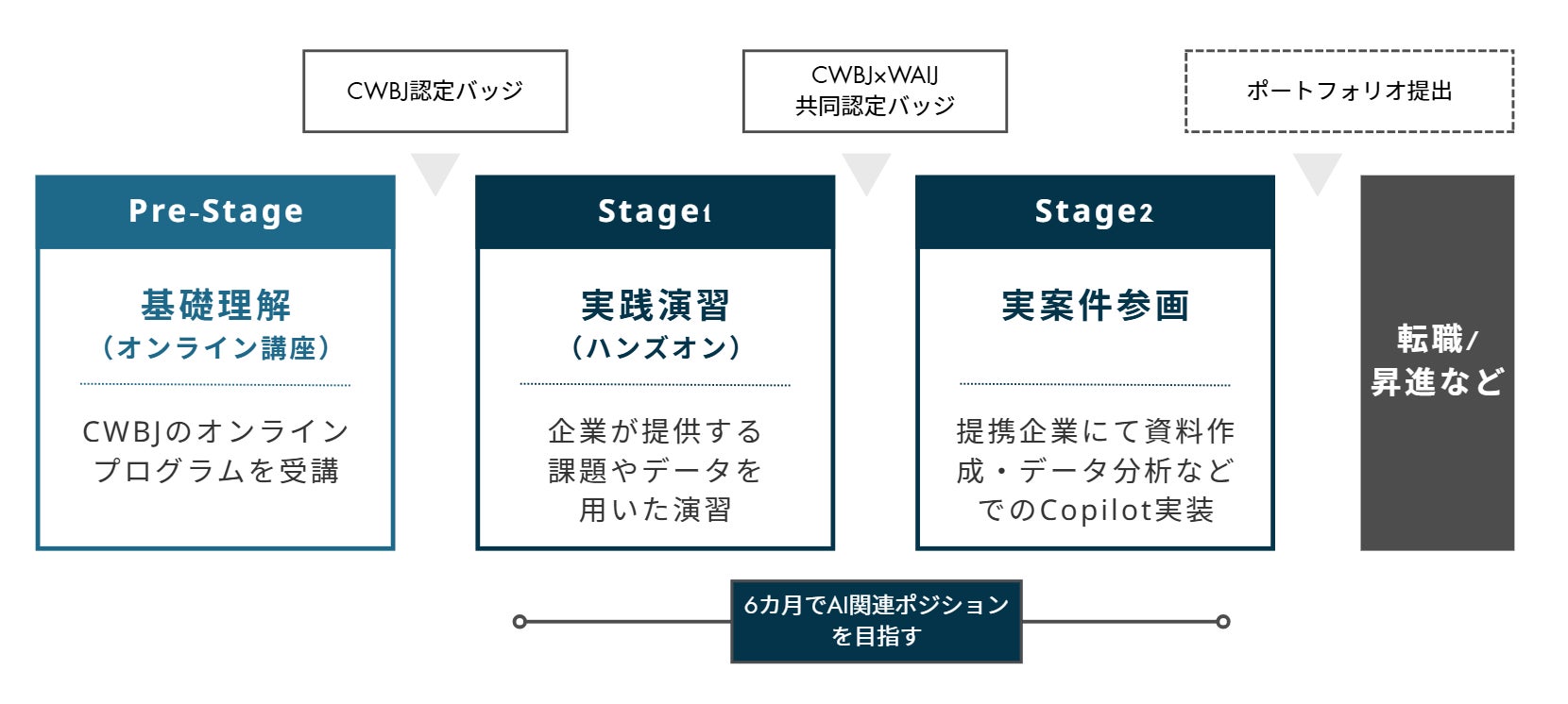 日本マイクロソフトとWAIJがノウハウを融合した共同開発プログラムです。最新かつ世界基準のCopilot活用スキルを段階的に習得できる、信頼性の高い内容です。