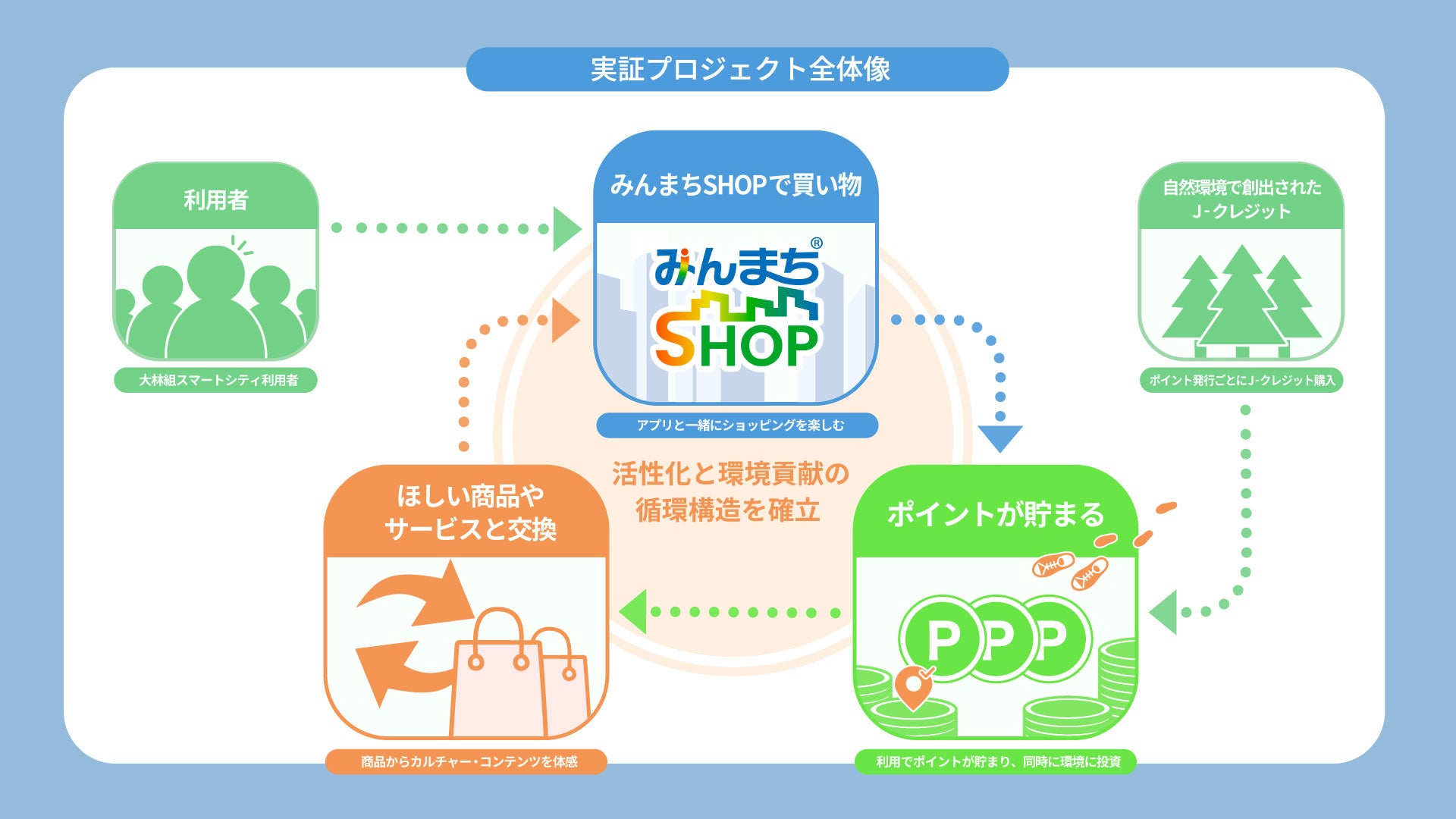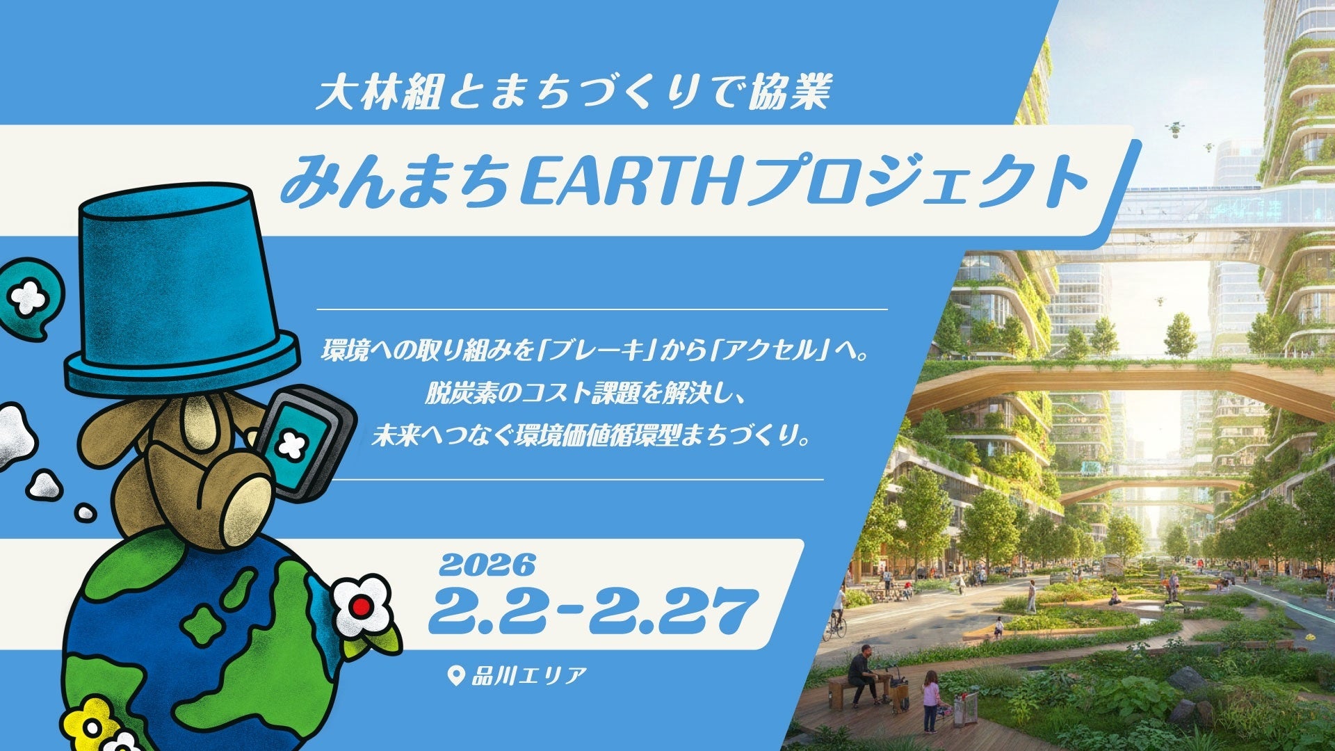 aora株式会社(本社:東京都渋谷区、代表取締役:堀井紳吾、以下「当社」)は、株式会社大林組(本社:東京都港区、代表取締役社長兼CEO:佐藤俊美、以下「大林組」)、一般社団法人関西イノベーションセンター(大阪府大阪市、理事長: 早乙女実、以下「MUIC Kansai」)と協働し、コストの課題を抱え続ける脱炭素の壁を打ち破るべく、カーボンクレジット連動ポイント「PUC(ぷく)」を活用した持続可能なまちづくりの実証実験「みんまちEARTHプロジェクト」を開始します。本プロジェクトはMUIC Kansaiとの「環境」連携プロジェクトとして、環境への取り組みを「ブレーキ(コスト)」から「アクセル(集客/インセンティブ)」へと転換する新しい環境経済エコシステムの構築を目指します。
