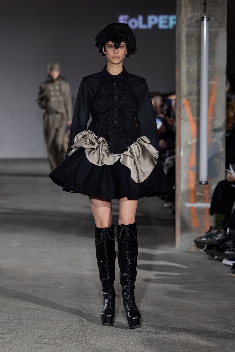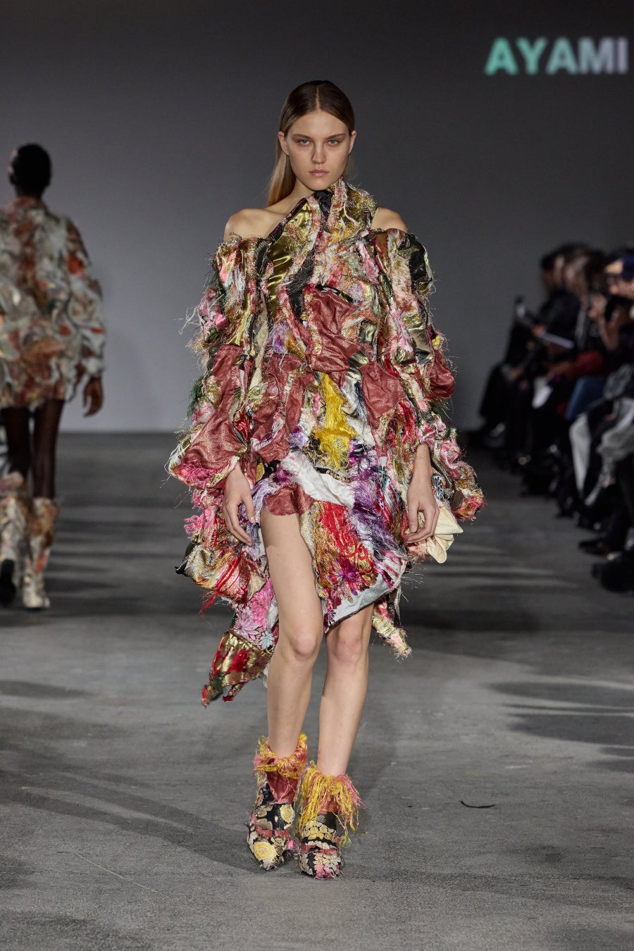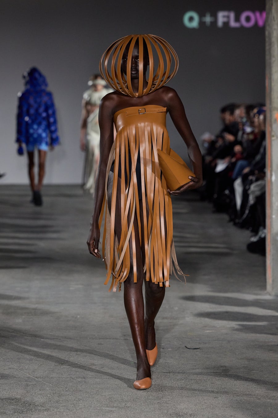 Q+FLOW (キューフロウ)は日本人デザイナーによる、国産の素材を使用し、日本の職人によって縫製されたMade in Japanのバッグ&アクセサリーブランド。常に自問自答し模索をし続け(Self-Questioning, Quest)、大きな社会の流れ(Flow)の中で成長していきたい。社会の中でブランドとしてどういう形で貢献でき、より良い循環ができるか常に挑戦したいというデザイナーの想いから生まれている。今回のショーではバッグの生産で使われなかった余りの革で衣装を制作した。