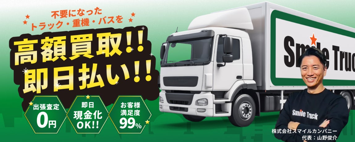 株式会社スマイルカンパニー(本社:埼玉県川越市、代表取締役:山野俊介、以下、スマイルカンパニー)は、トラック・バス・重機に特化した買取事業「スマイルトラック」を、2026年1月より開始いたしました。本事業は、物流・建設・運送など社会インフラを支える現場で使われてきた“働くクルマ”を、役目を終えた段階で止めてしまうのではなく、次に必要とする現場へとつなぎ直すことを目的としています。