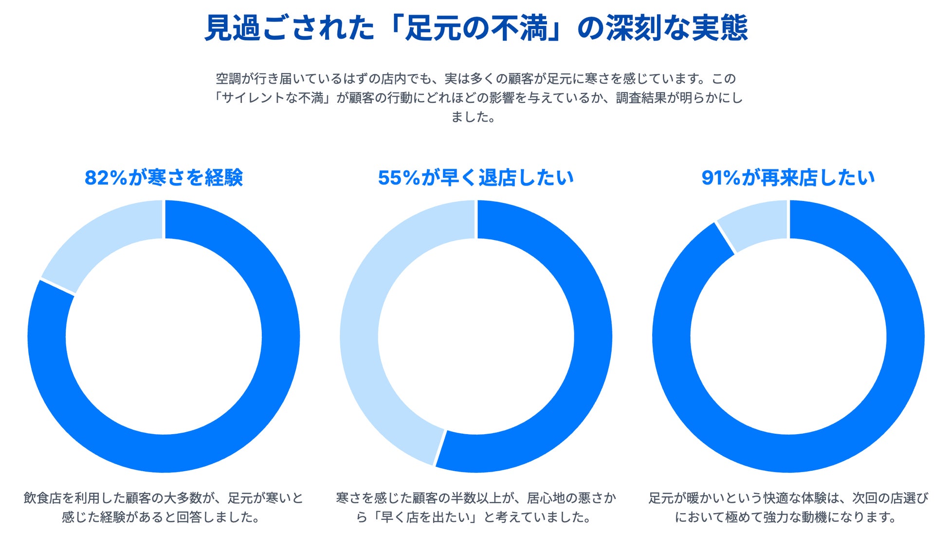 その結果、来店客の大多数が飲食店で足元の寒さを感じており、その不快感が「早く店を出たい」という退店意欲や、その後の再来店意欲に深刻な影響を与えていることが明らかになりました。当社は、顧客が不満を口にすることなく静かに離れていくこの現象を「サイレント・チャーン」と名付け、飲食店経営における見過ごされた経営リスクとして警鐘を鳴らします。