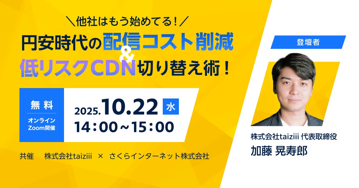 株式会社taiziii(本社:東京都渋谷区、代表取締役:加藤晃寿郎)は、さくらインターネット株式会社(本社:大阪府大阪市、代表取締役:田中邦裕)主催のオンラインセミナー「円安時代に備える配信コスト最適化&低リスクCDN移行術」を、2025年10月22日(水)14:00〜15:00に開催いたします。